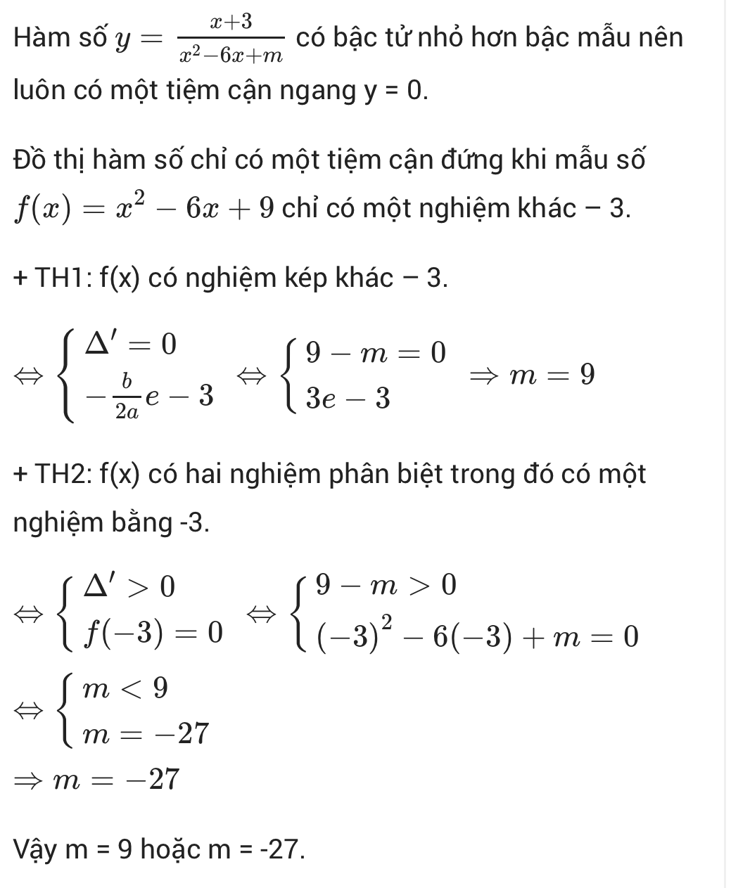 Cho hàm số:y=x+3/x mũ 2-6x+m. Có tất cả bao nhiêu giá trị thực của tham số m để đồ thị hàm số chỉ có 1 tiệm cận đứng và 1 tiệm cận ngang?