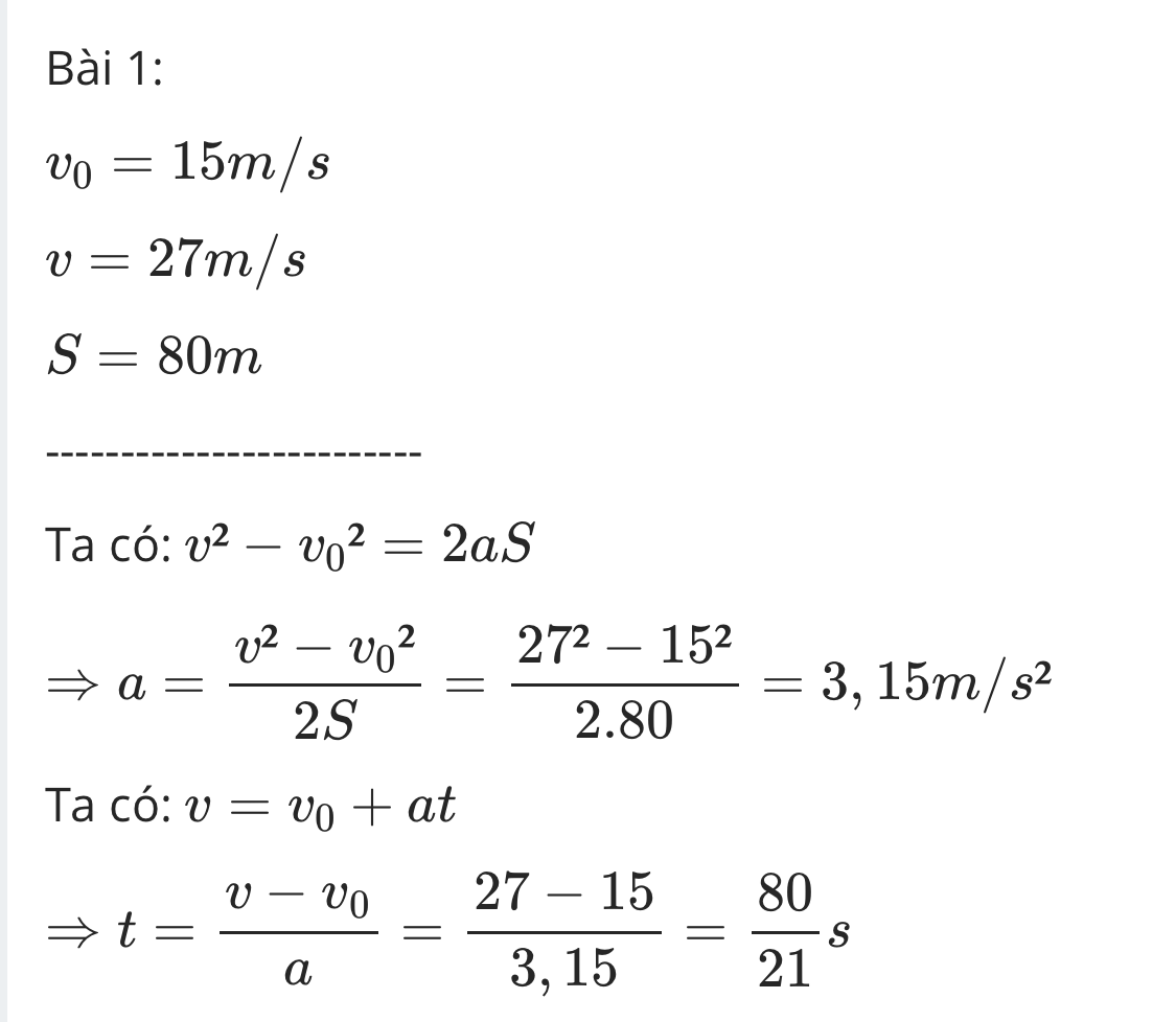 Một tàu thuỷ tăng tốc đều đặn từ 15 m/s đến 27 m/s trên một quãng đường thẳng dài 80 m. Thời
