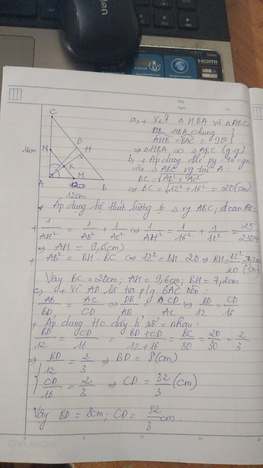 Bài 2: Cho tam giác ABC vuông tại A có AB = 12 cm, AC = 16 cm. Vẽ đường cao AH.
