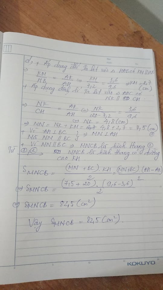 d) Trên AH lấy điểm K sao cho AK = 3,6cm. Từ K kẽ đường thẳng song song BC cắt AB và AC lần lượt tại M và N. Tính diện tích tứ giác BMNC.