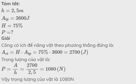 Khi đưa một vật lên cao 2,5m bằng một mặt phẳng nghiêng người ta phải thực hiện một công là 3600(J) .Biết hiệu suất của mặt phẳng nghiêng là 75%.Tính trọng lượng của vật
