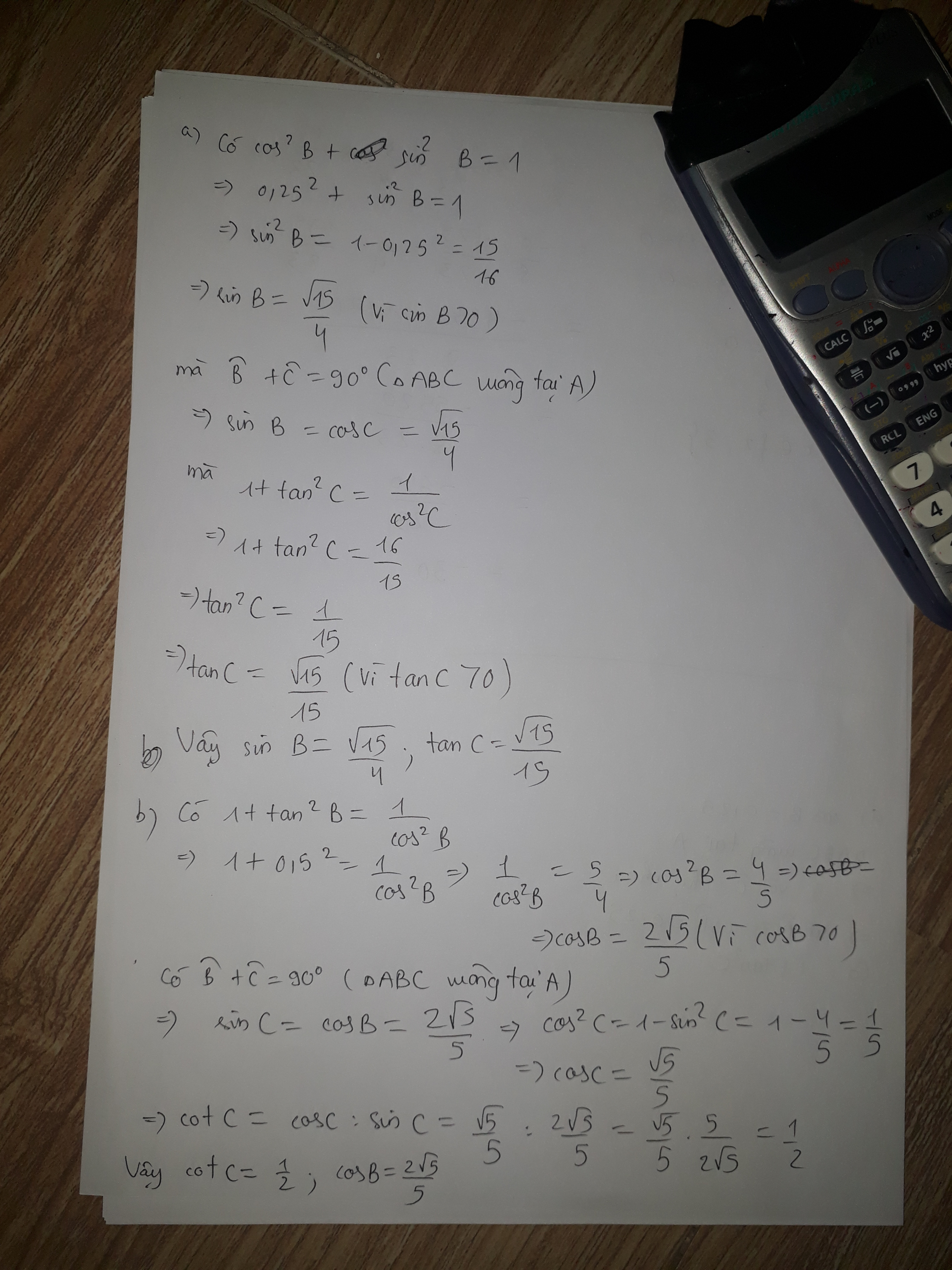 Cho tam giác ABC vuông tại A. a) nếu biết cosB = 0,25 tính tanC và sinB. b) nếu biết tanB = 0,5 tính cosB và cotC
