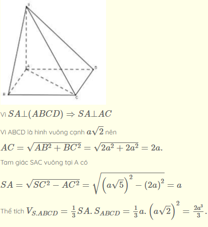 Cho hình chóp tứ giác S.ABCD có đáy ABCD là hình vuông cạnh a cân 2 cạnh bên SA vuông góc với mặt đáy và SC=a cân 5 tính thể tích V của khối chóp S.ABCD