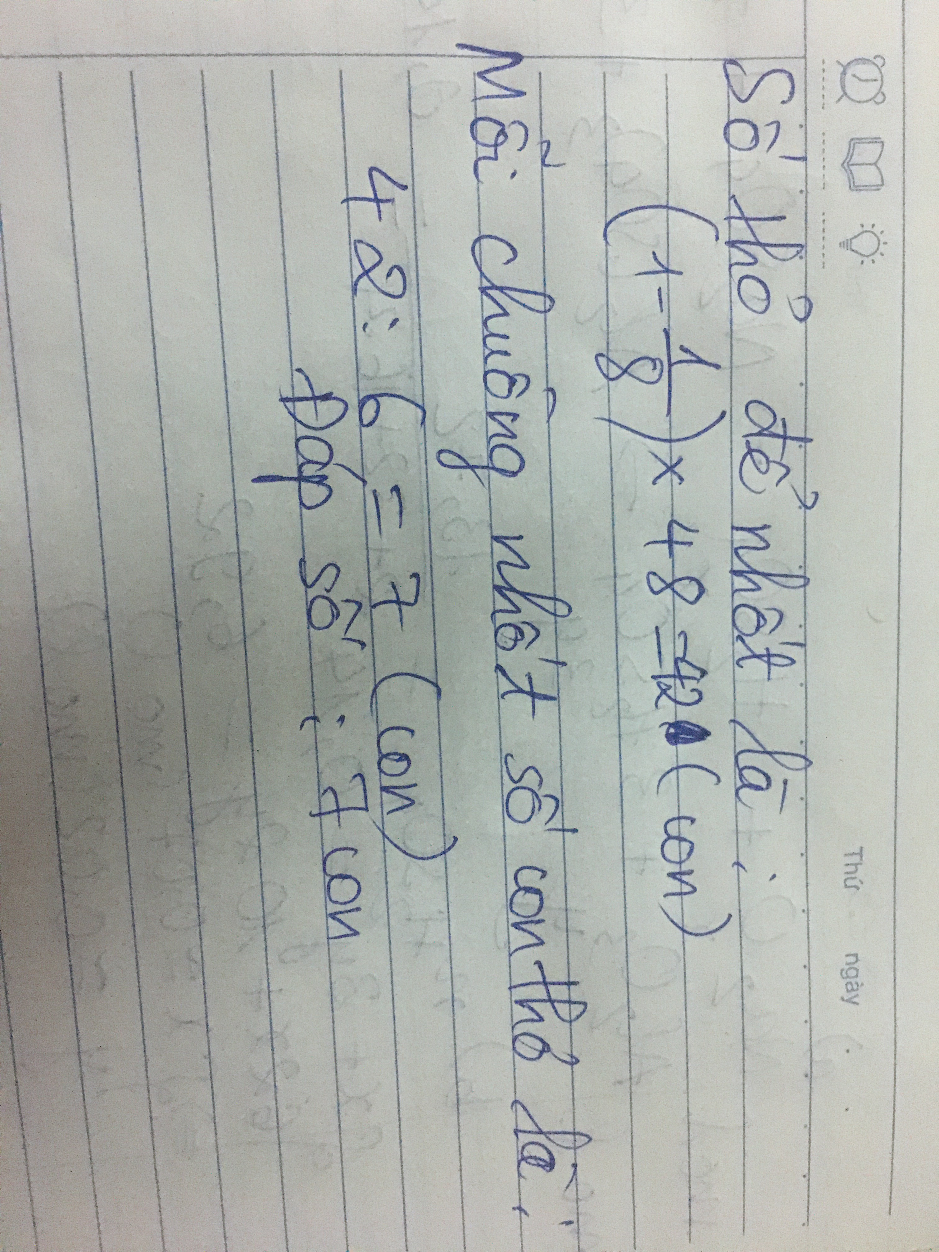 Một người nuôi 48 con thỏ 1/8 số thỏ người đó nhốt đều số thỏ còn lại vào 6 chuồng hỏi mỗi chuồng nhốt mấy con thỏ