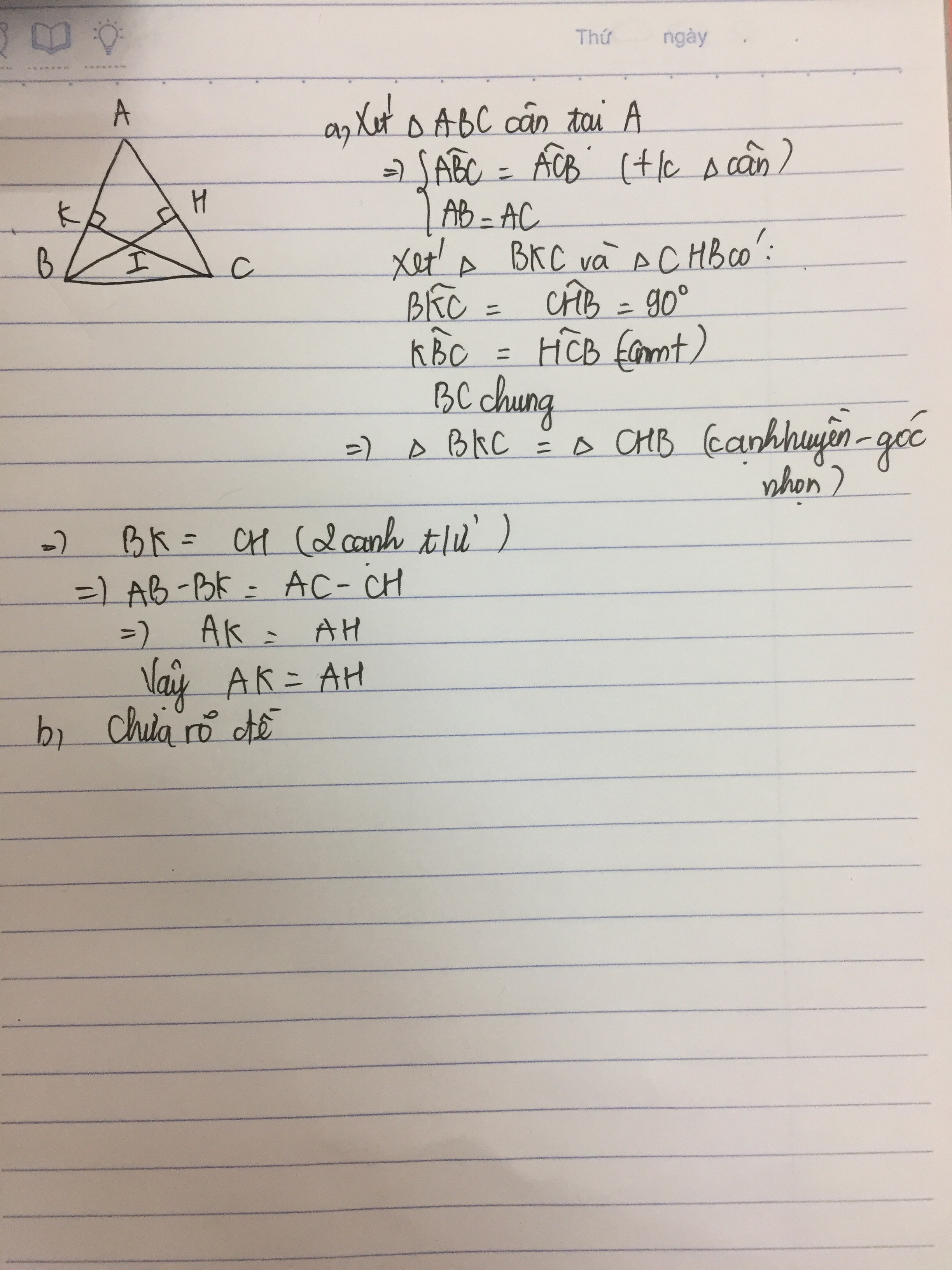 Cho ΔABC cân tại A, BH ⊥ AC tại H, CK ⊥ AB tại K