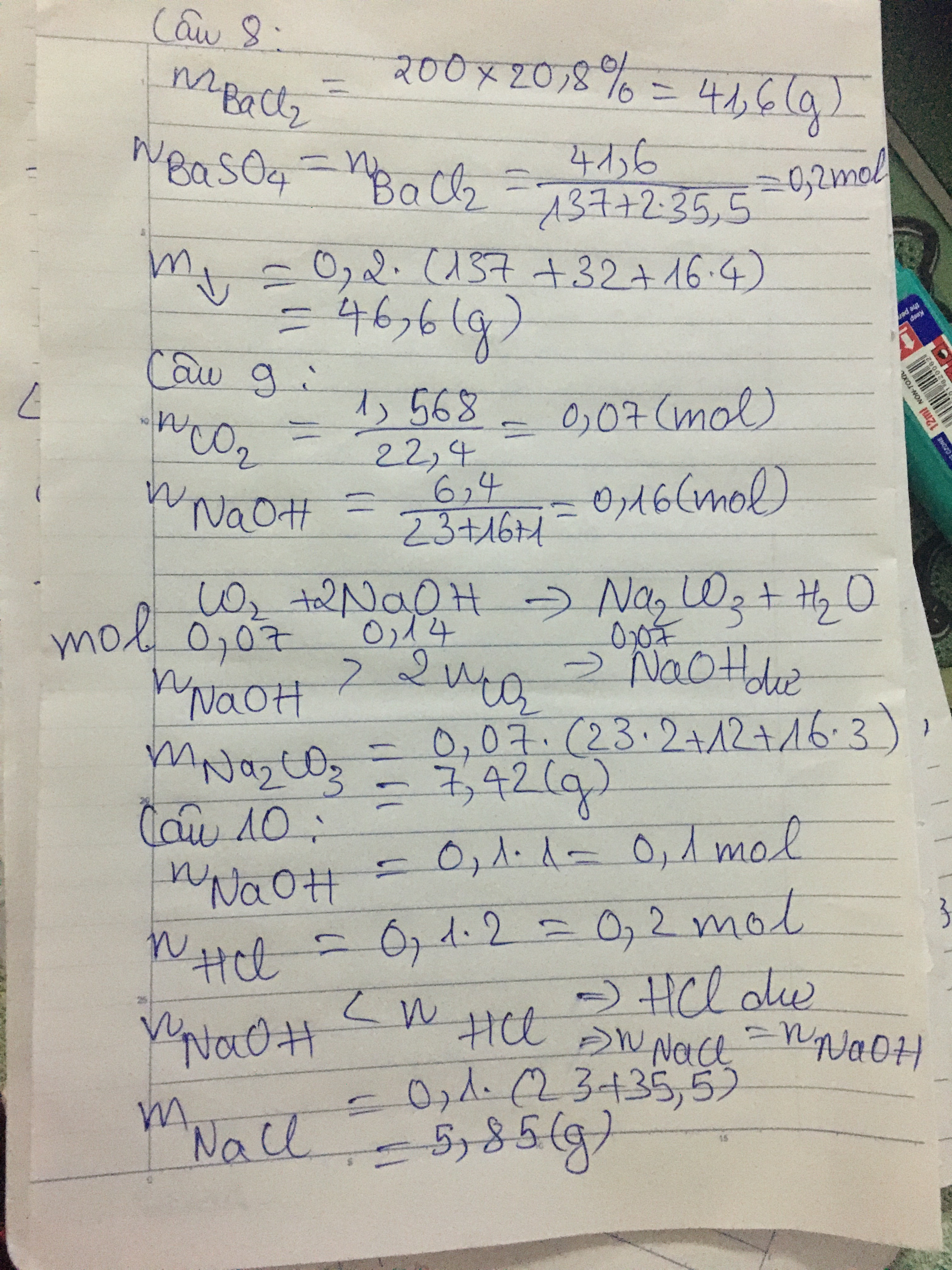 Câu 8 mct = mdd×C/100 = 200×20,8/100=41,6 g Số mol BaCl2 là n=m/M = 41,6/208=0,2 mol PTHH BaCl2 +Na2SO4 ----- BaSO4 + 2NaCl