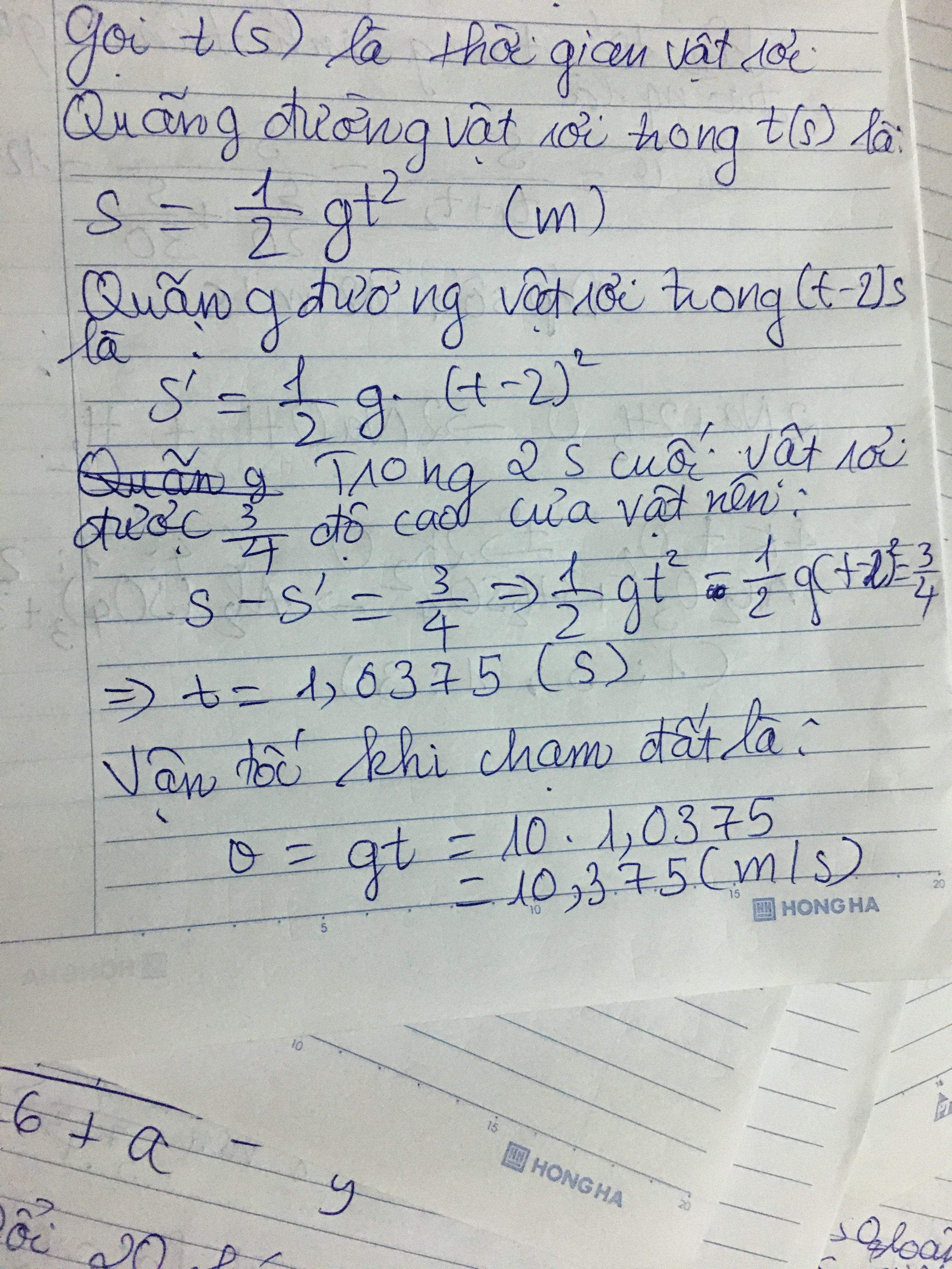 Một vật rơi tự do từ độ cao s trong 2 giây cuối cùng trước khi chạm đất vật rơi được 3/4 độ cao s đó. Tính thời gian rơi độ cao s và vận tốc của vật khi chạm đất lấy g=10m/s2