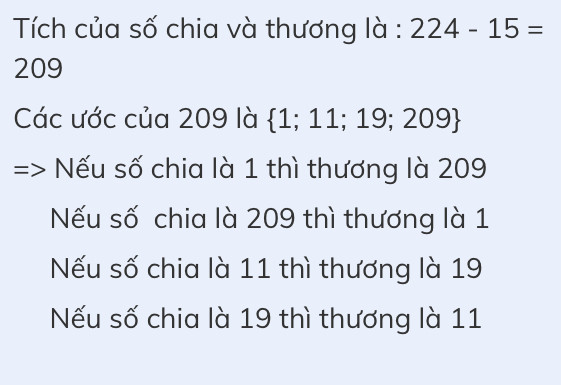 trong một phép tính chia số bị chia là 224 số dư là 15.Tìm số chia và thương