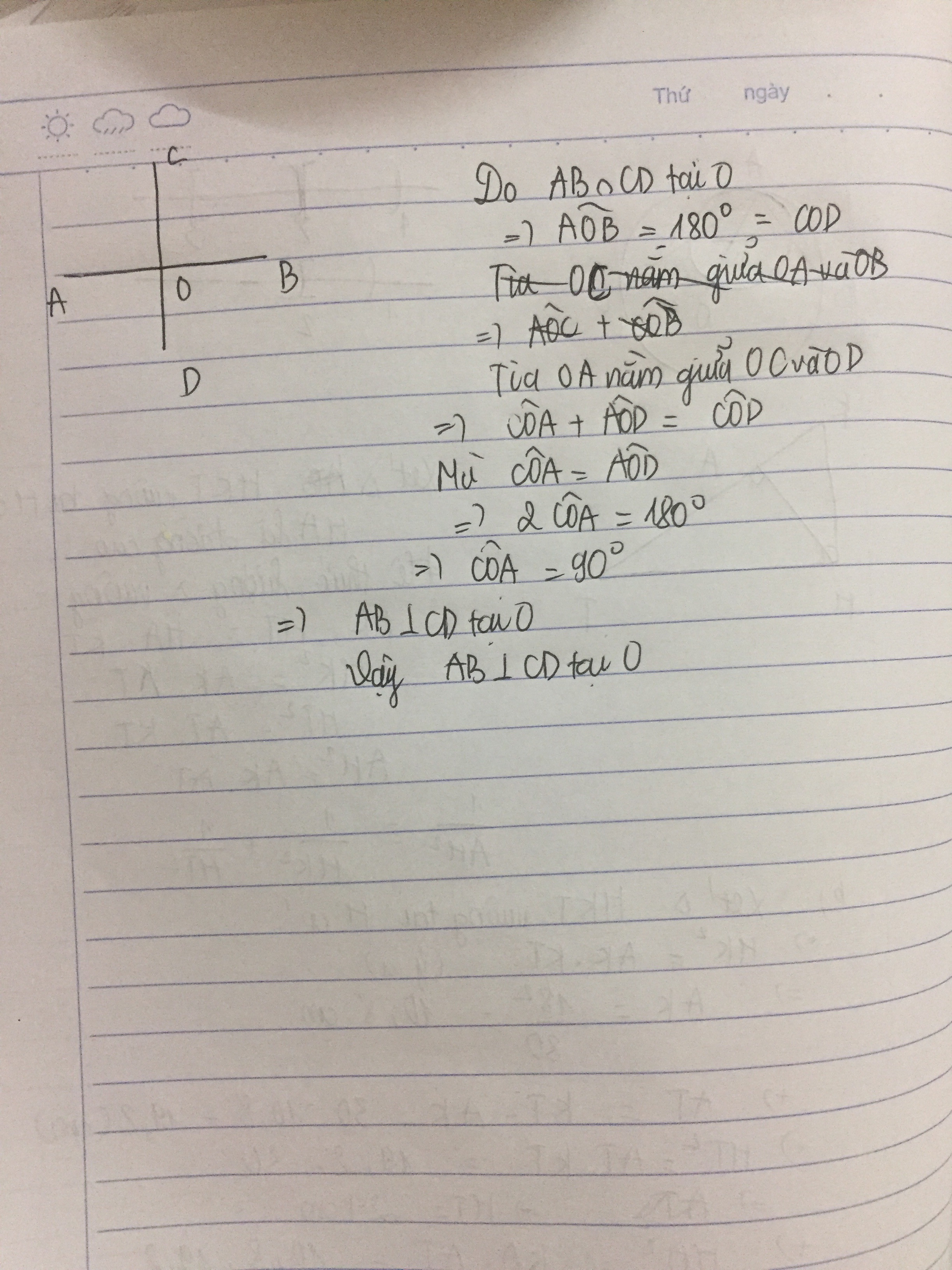 Cho hai đường thẳng AB và CD cắt nhau tại 0 sao cho góc AOC = góc AOC. Chứng mình AB vuông góc với CD