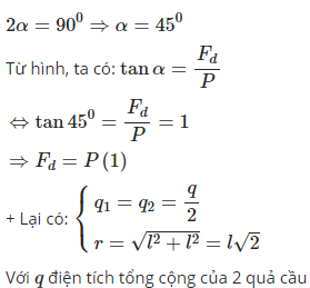 . Hai quả cầu kim loại nhỏ giống nhau treo vào một điểm bởi hai sợi dây l=20cm. Truyền cho mỗi quả cầu điện tích q = 4. 10-7 C, chúng đẩy nhau, các dây treo hợp thành góc 900. Lấy g=10m/s2. Tìm khối lượng mỗi quả cầu.