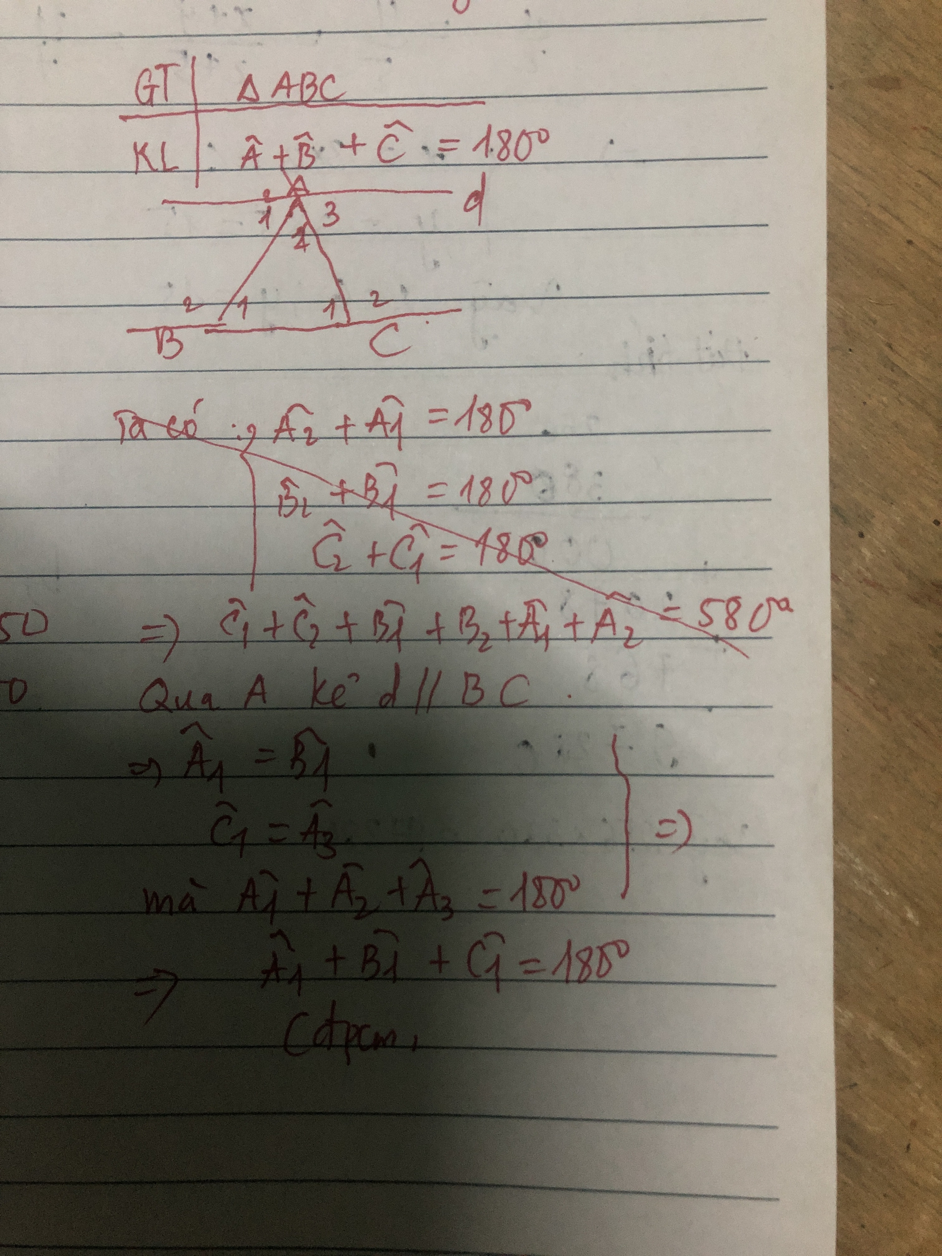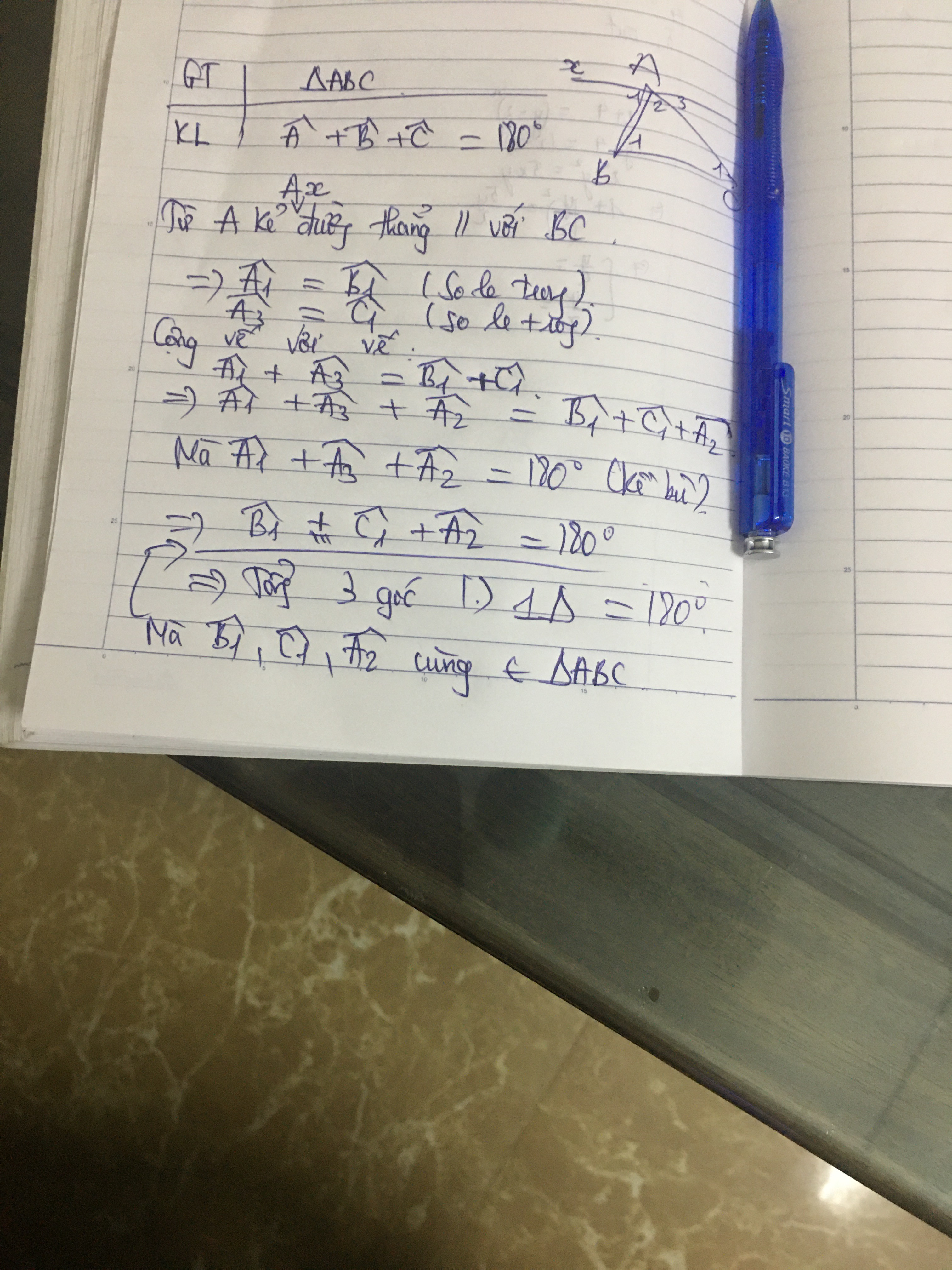 Viết gải thiết và kết luận sau đó chứng minh định lí:Tổng 3 góc của một tam giác bằng 180 độ