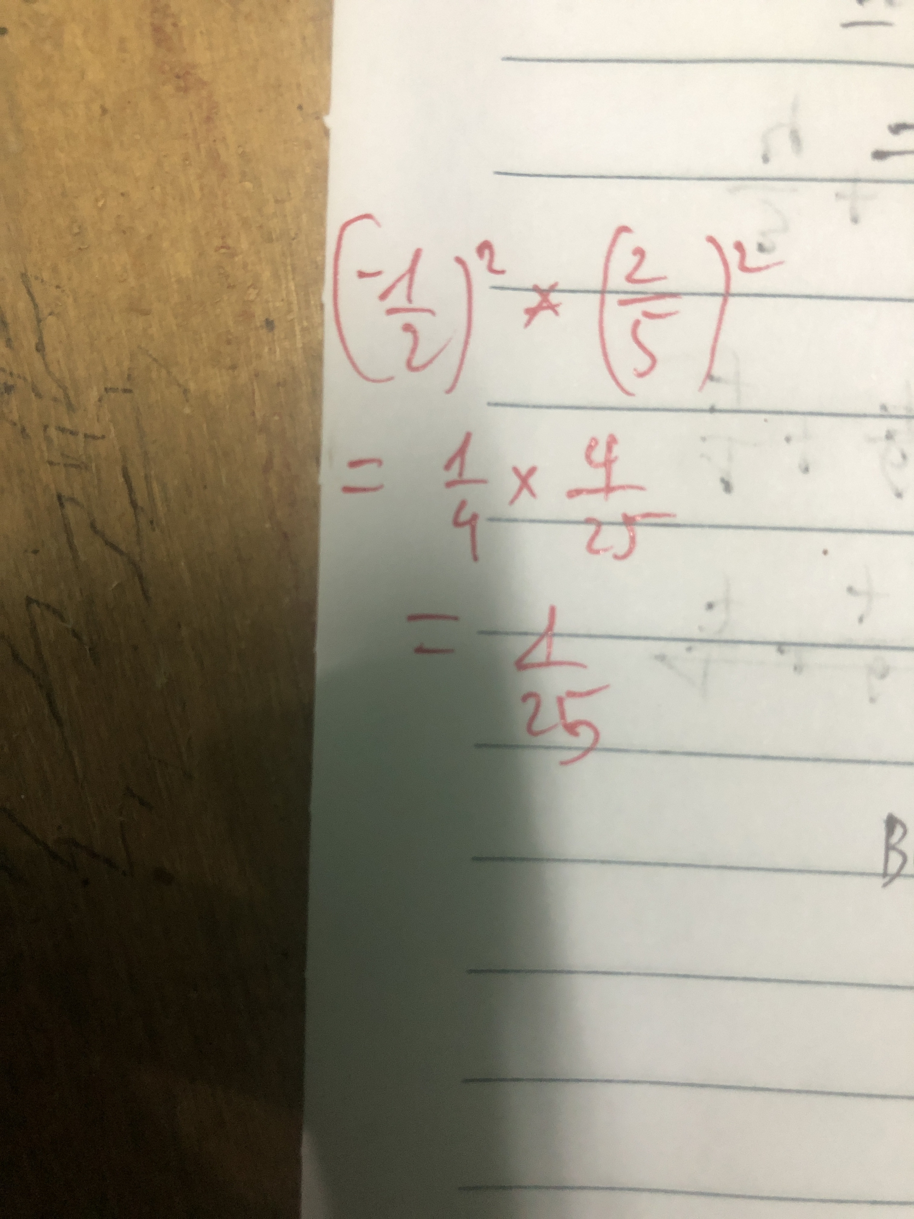 \[{\left( {\frac{{ - 1}}{2}} \right)^2}.{\left( {\frac{2}{5}} \right)^2} = \frac{{{1^2}{{.2}^2}}}{{{2^2}{{.5}^2}}} = \frac{1}{{25}}\]