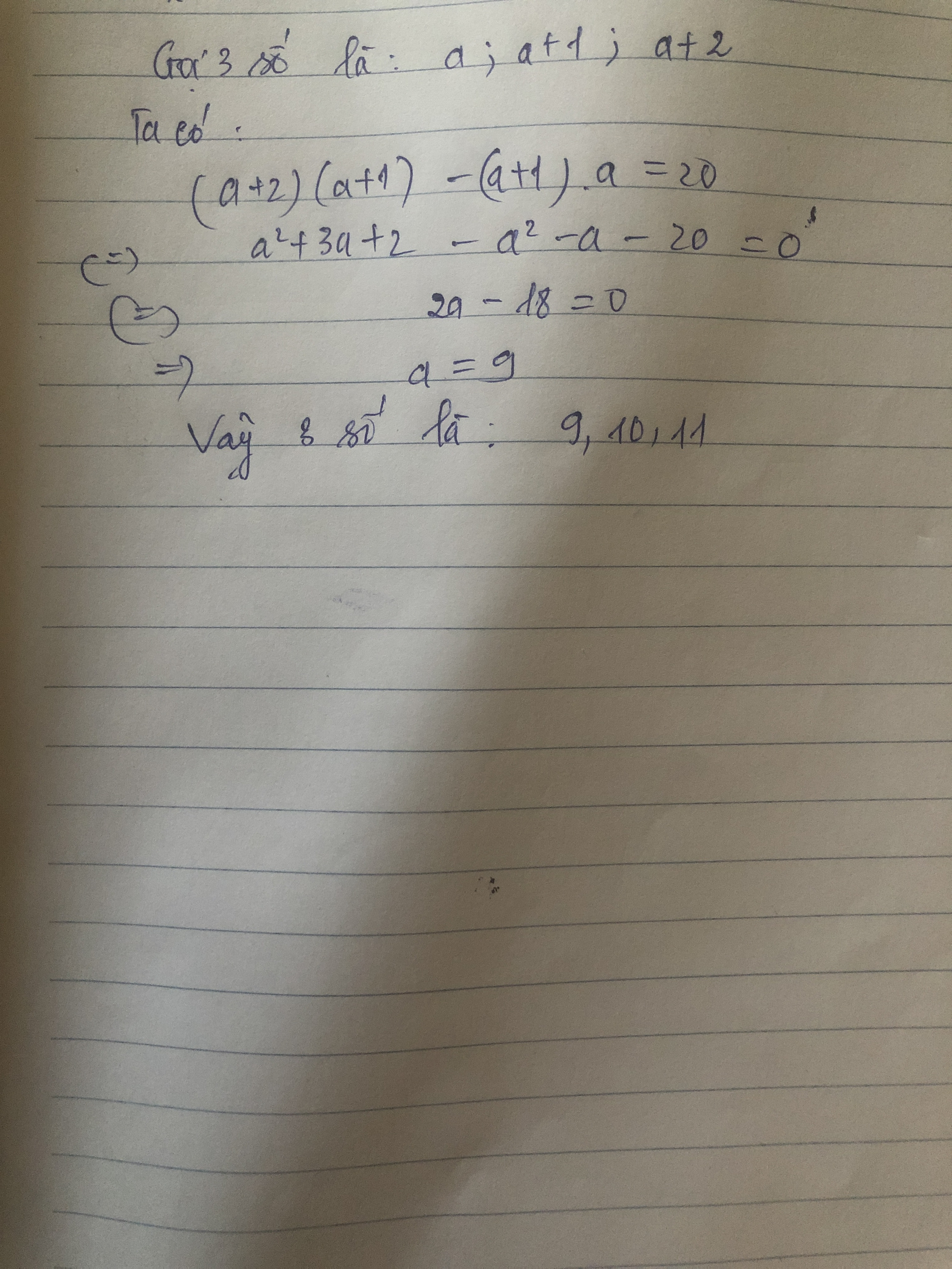Tìm ba số liên tiếp biết tích hai số sau lớn hơn tích hai số trước 20 đơn vị