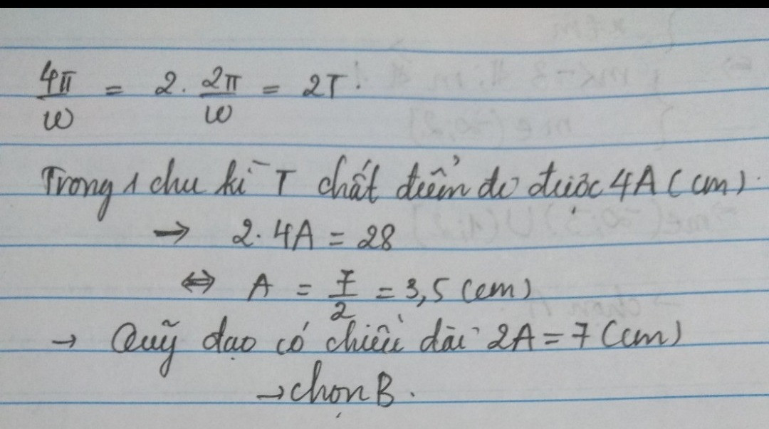 Một chất điểm dao động điều hoà trên trục Ox với tần số góc. Từ thời điểm t đến thời điểm t +4pi/ w, chất điểm đi được một quãng đường dài 28 cm. Chất điểm dao động trên đoạn thẳng có chiều dài là: