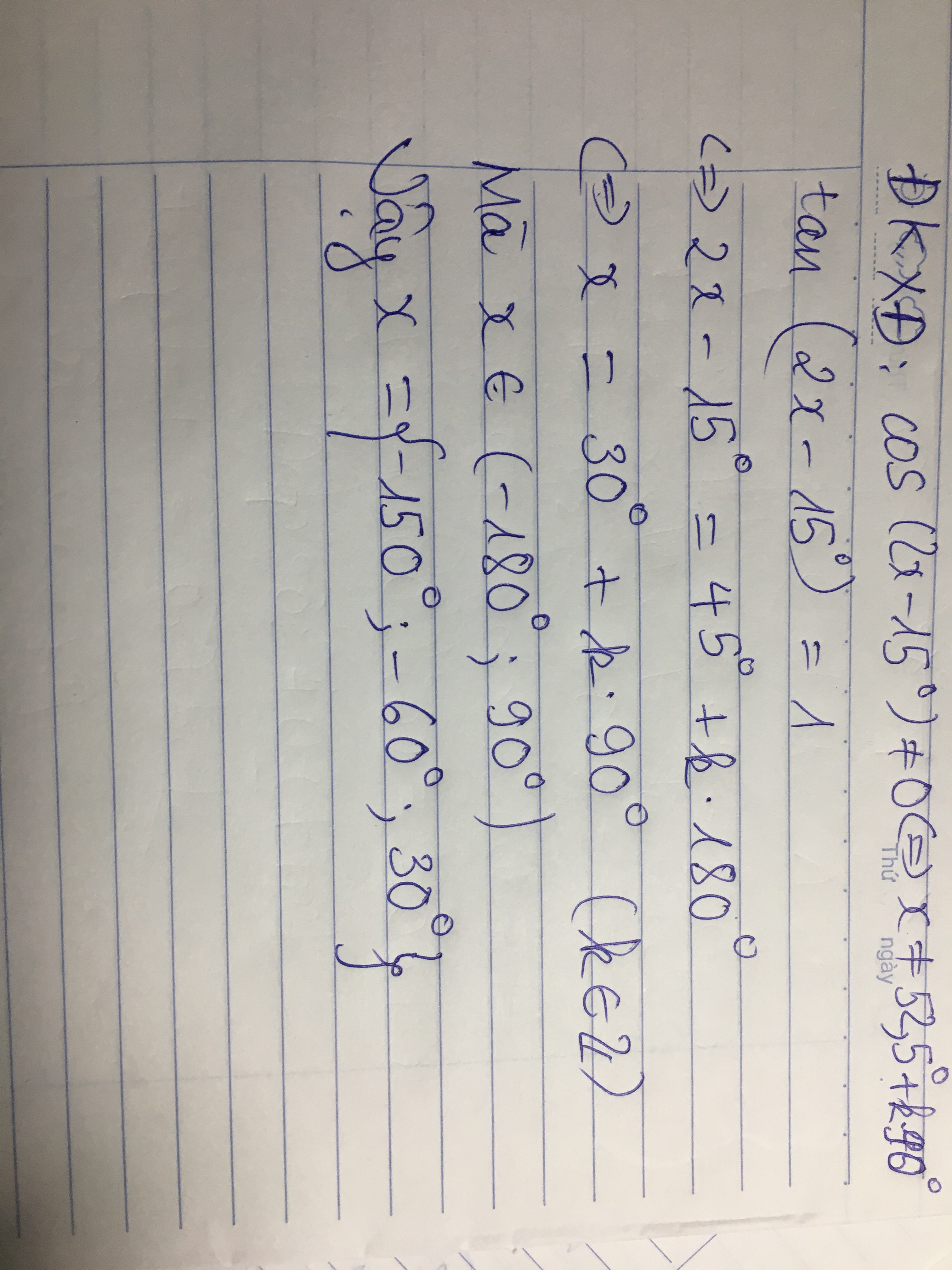 tan2x-15o=1<=>2x-15o=45o+180o.k<=>2x=60o+180o.k, k∈Z<=>x=30o+90o.k, k∈ZMà -180o<x<90o=>-180o<30o+90o.k<90o<=>-73<k<13Do k∈Z=>k=-2;-1;0k=-2=>x=-150ok=-1=>x=-60ok=0=>x=30oVậy x=-150o;-60o;30o.