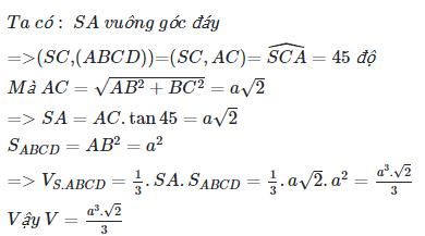 Cho hình chóp S.ABCD có đáy là hình vuông cạnh a,SA vuông góc với đáy, SC tạo đáy một góc =45 độ.Tính thể tích V của khối chóp S.ABCD