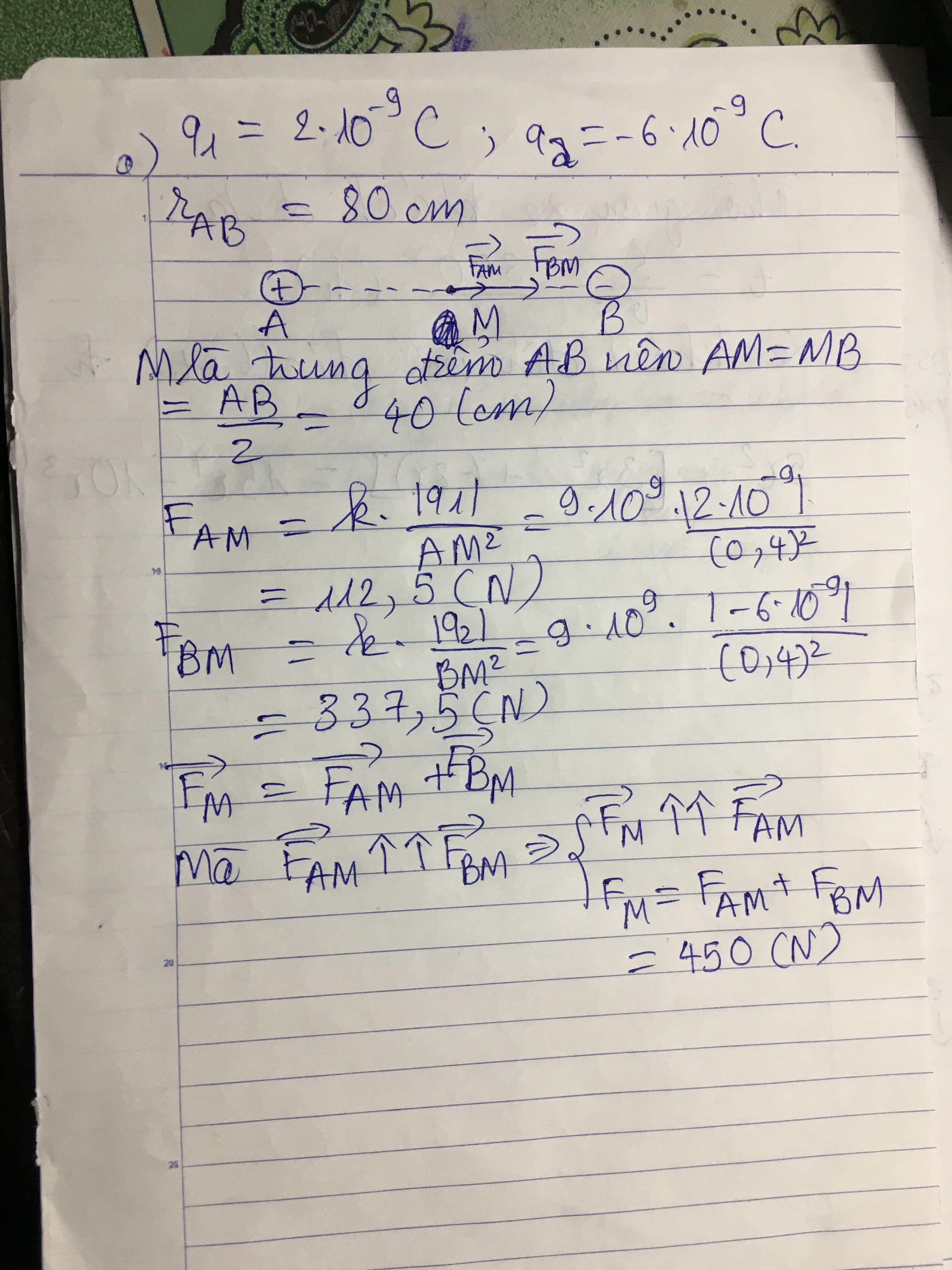 u 1: Cho hai điện tích điểm q1 = 2nC và q2 = - 6nC đặt lần lượt tại hai điểm A và B trong không khí cách nhau 80cm. Tính cường độ điện trường tổng hợp gây ra bởi hai điện tích này tại điểm: