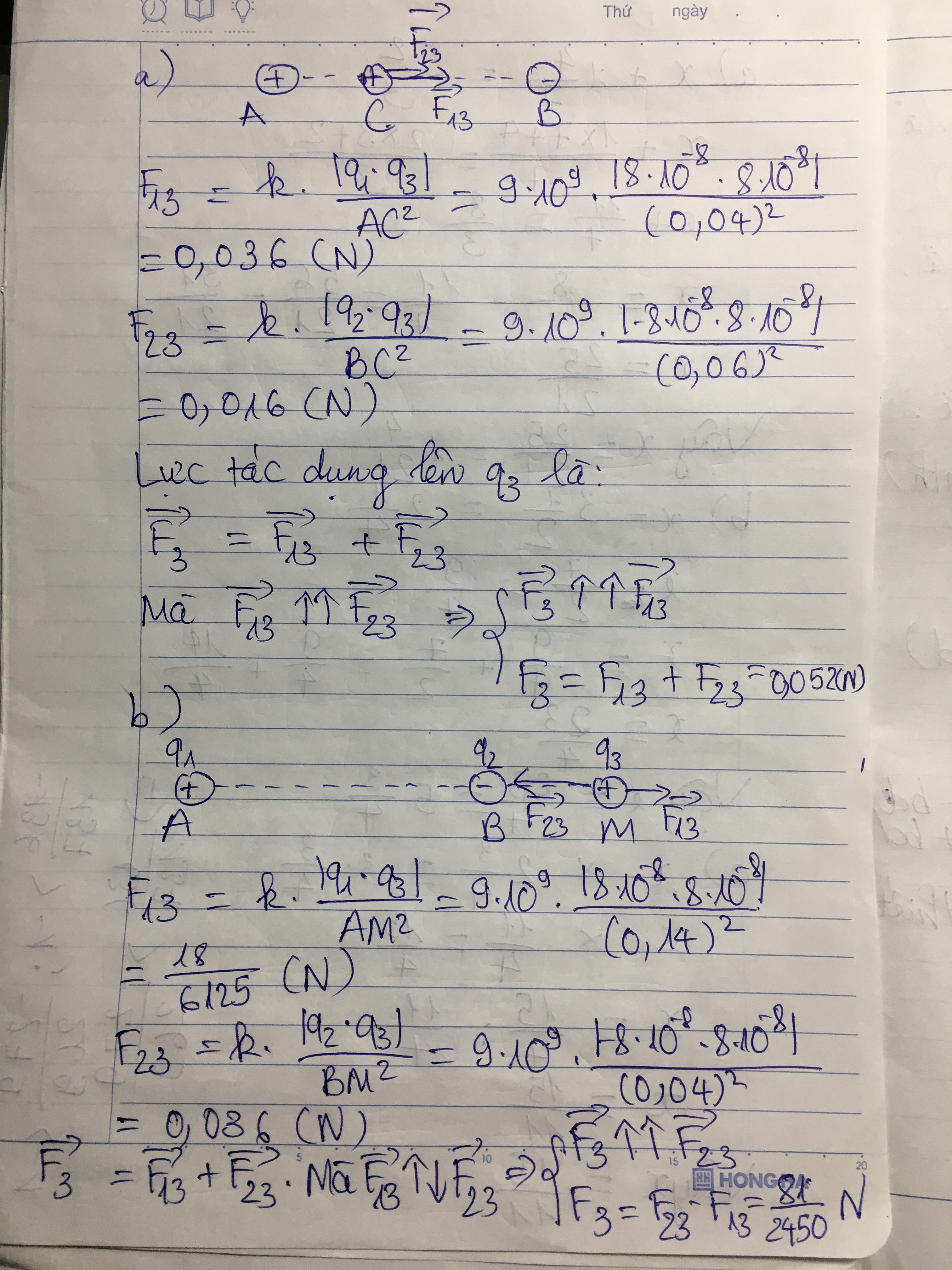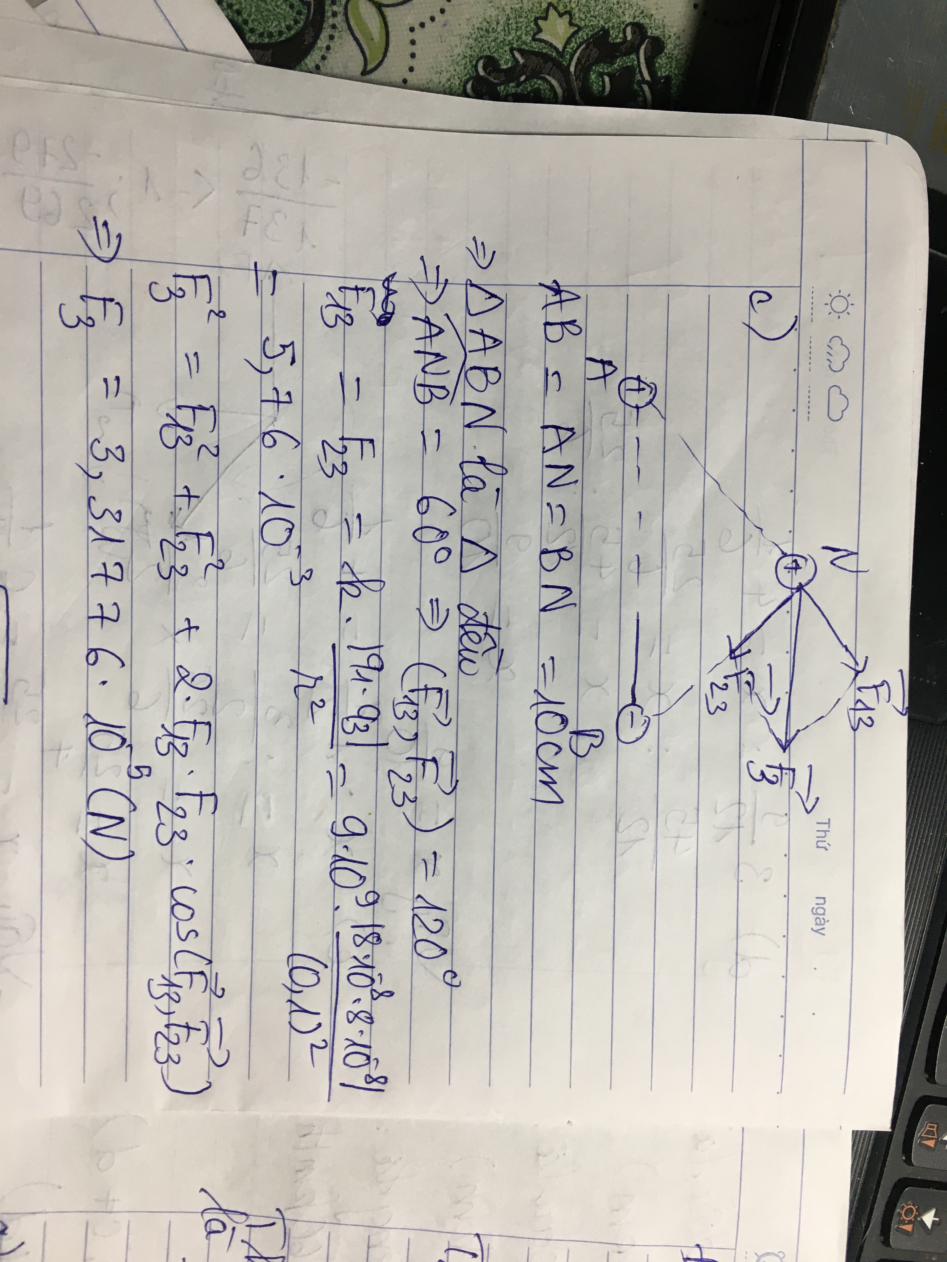 Hai điện tích q1=8.10^-8,q2=-8.10^-8 đặt tại A và B trong không khí AB=10cm.Xác định lực tác dụng lên q3=8.10^-8,nếu
