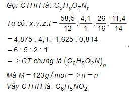 Thành phần các nguyên tố của một hợp chất X có 58,5% C; 4,1% H; 11,4% N; 26% O. Khối lượng mol phân tử của hợp chất X là 123g. Xác định công thức hóa học của hợp chất.
