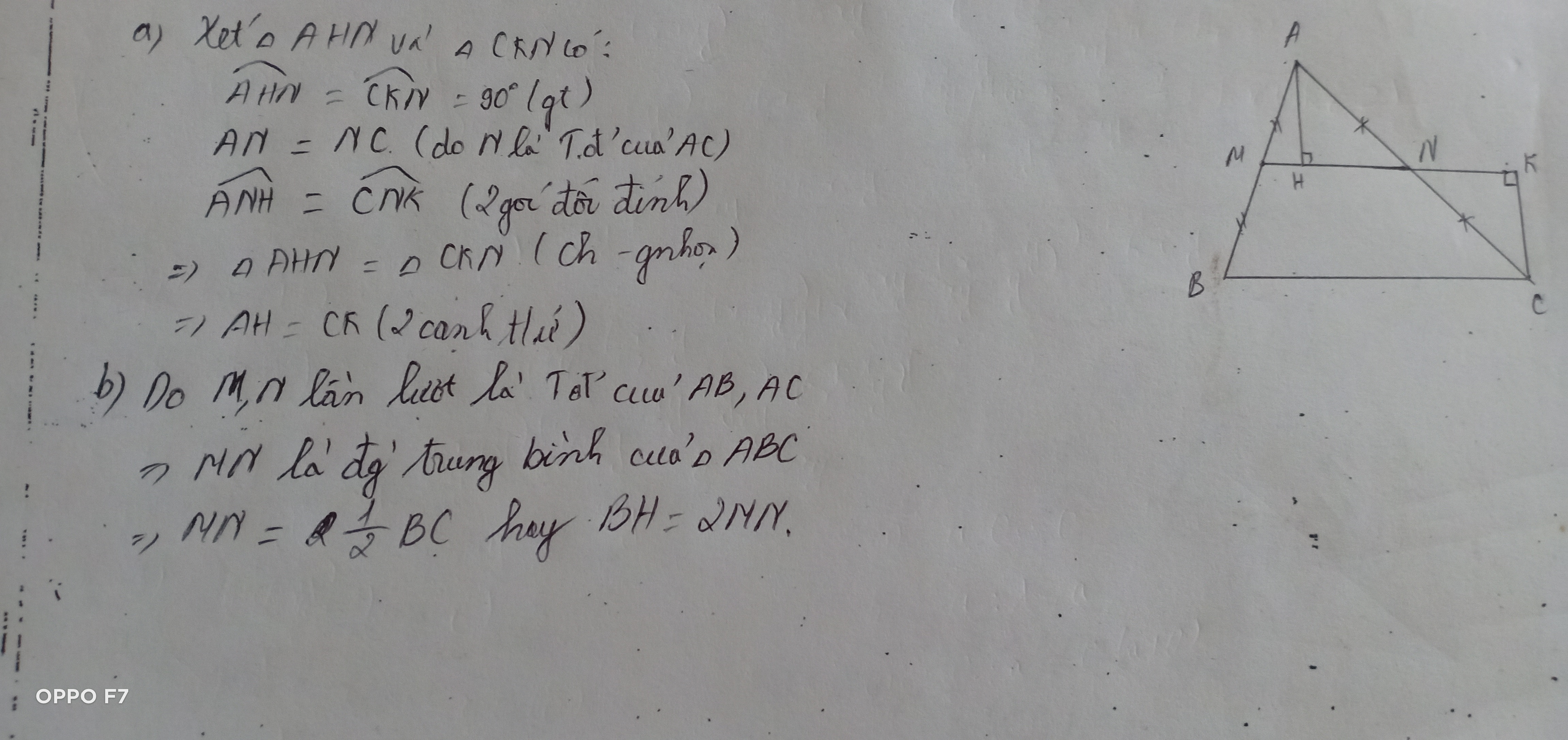 cho tam giác abc có 3 góc đều nhọn. cho m,n lần lượt à trung điểm của ab,ac.ké ah vuông mn tại h,ck vuông mn tại k.CMR a)AH=CK