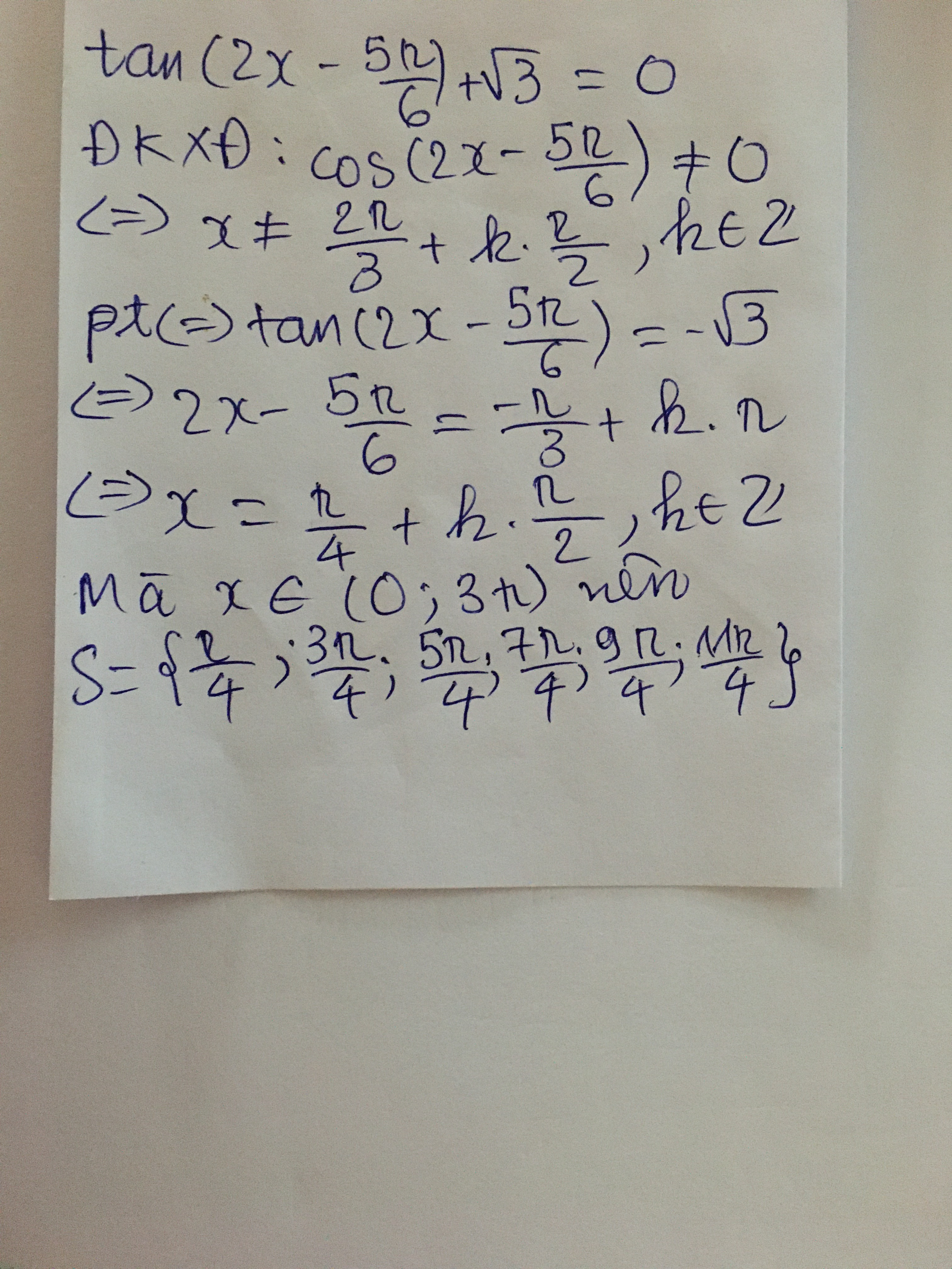 tan2x-5π6+3=0, đk: x≠2π3+kπ2, k∈Z<=>tan2x-5π6=-3<=>2x-5π6=-π3+kπ, k∈Z<=>x=π4+kπ2, k∈Z tmx∈0;3π=>0<π4+kπ2<3π<=>-0,5<k<5,5Mà k∈Z=>k=0;1;2;3;4;5