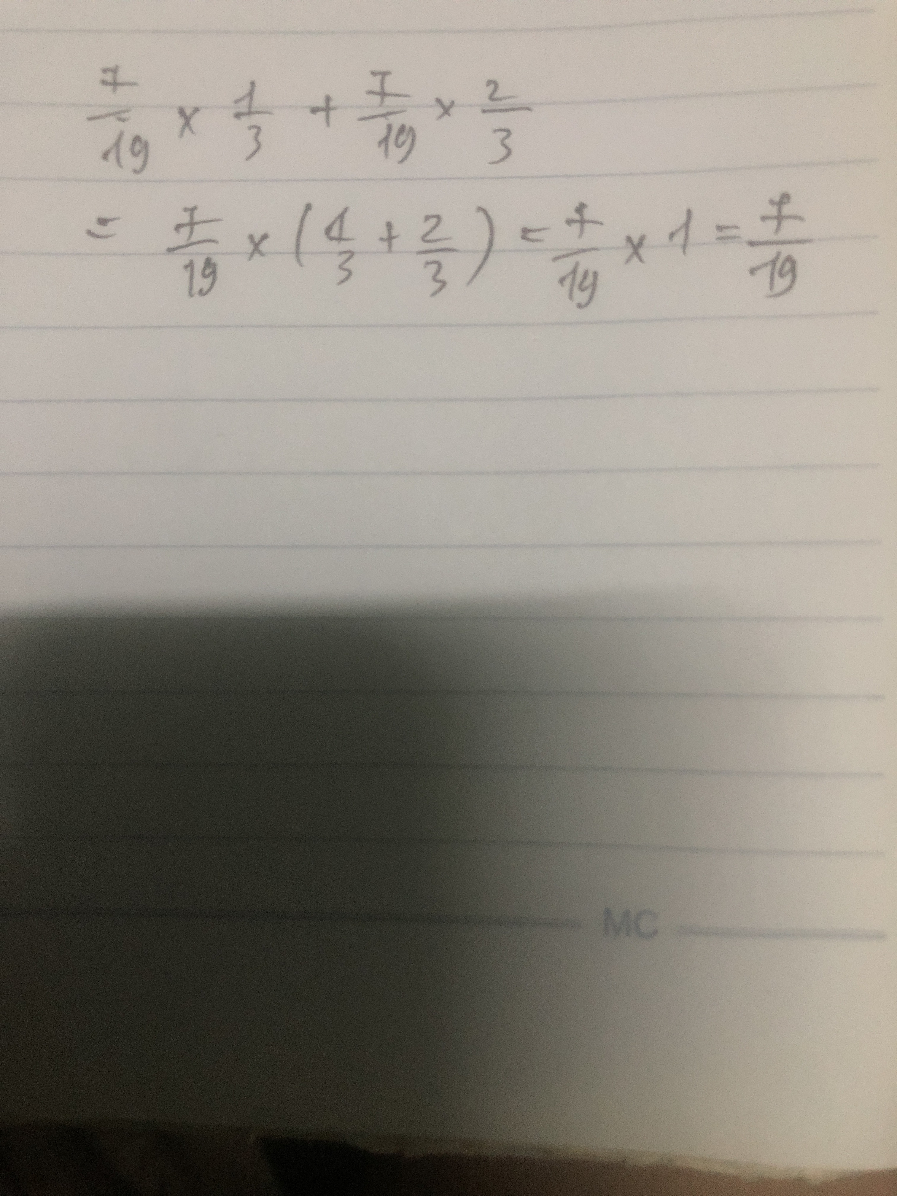 \[\frac{7}{{19}} \times \frac{1}{3} + \frac{7}{{19}} \times \frac{2}{3} = \frac{7}{{19}} \times \left( {\frac{1}{3} + \frac{2}{3}} \right) = \frac{7}{{19}} \times 1 = \frac{7}{{19}}\]
