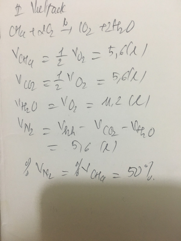 Đốt cháy hỗn hợp khí(N2,CH4),cần 11,2l O2 sinh ra 22,4l chất khí .Tính thể tích hỗn hợp khí ban đầu,phần trăm về thể tích mỗi khí trong hỗn hợp