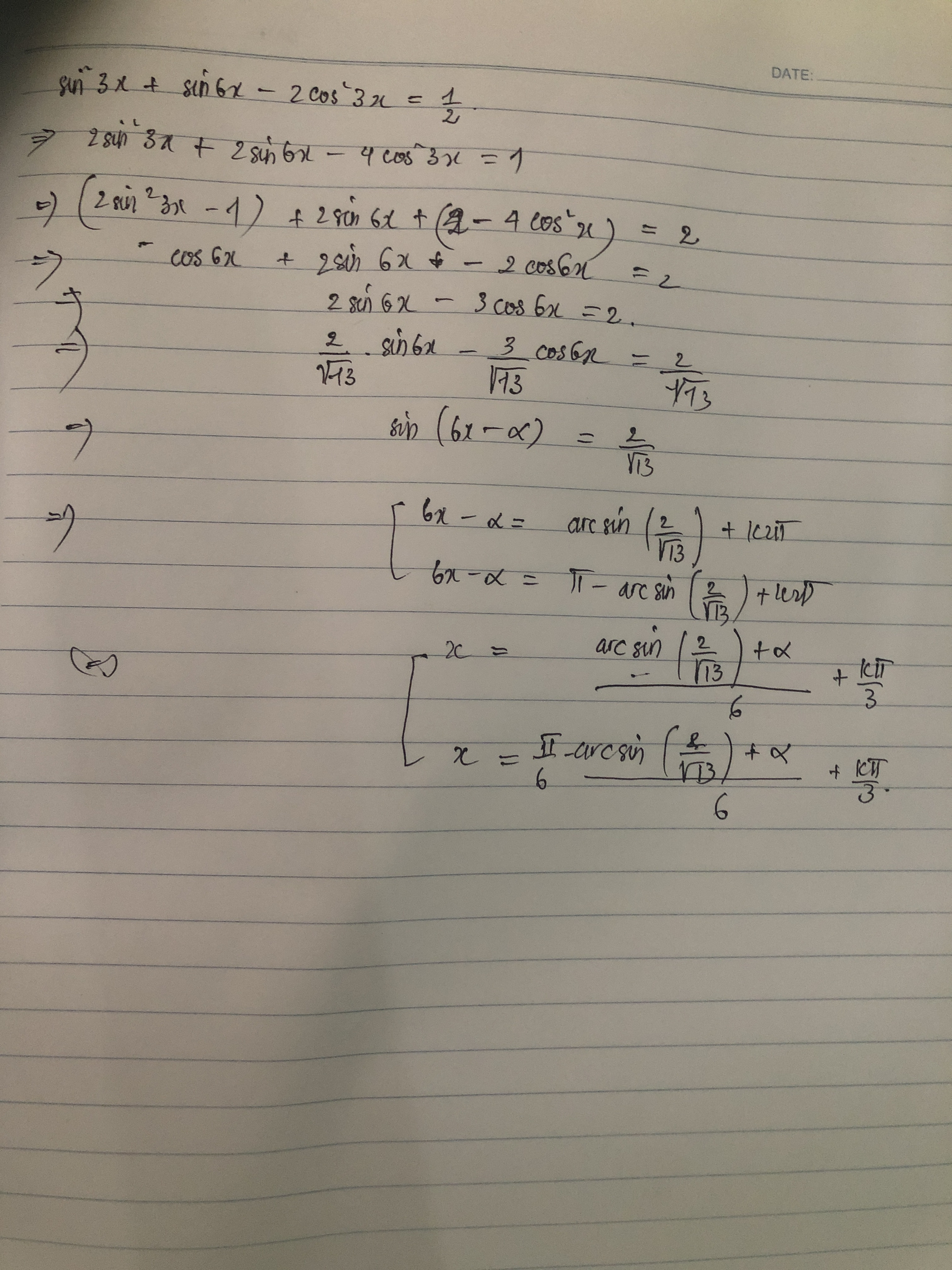 sin^2 3x + sin 6x - 2 cos^2 3x = 1/2