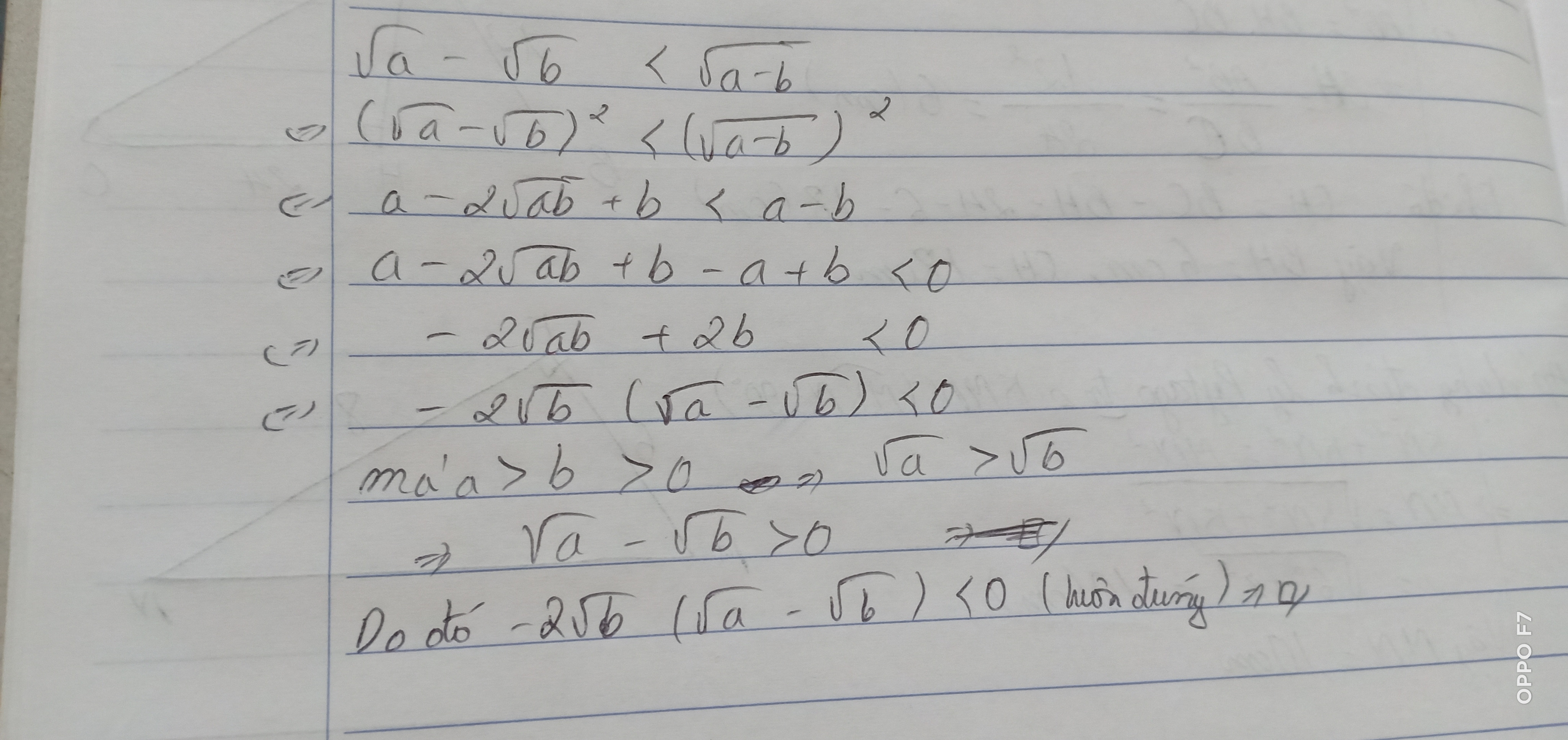 \Leftrightarrow {\left( {\sqrt a - \sqrt b } \right)^2} < {\left( {\sqrt {a - b} } \right)^2}\\
