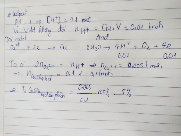 tiến hành điện phân 100 ml dd CuSO4 1M cho tới khi PH của bằng 1 thì ngừng điện phân ( coi thể tích dd không đổi .% CuSO4 đã bị điên phân là..