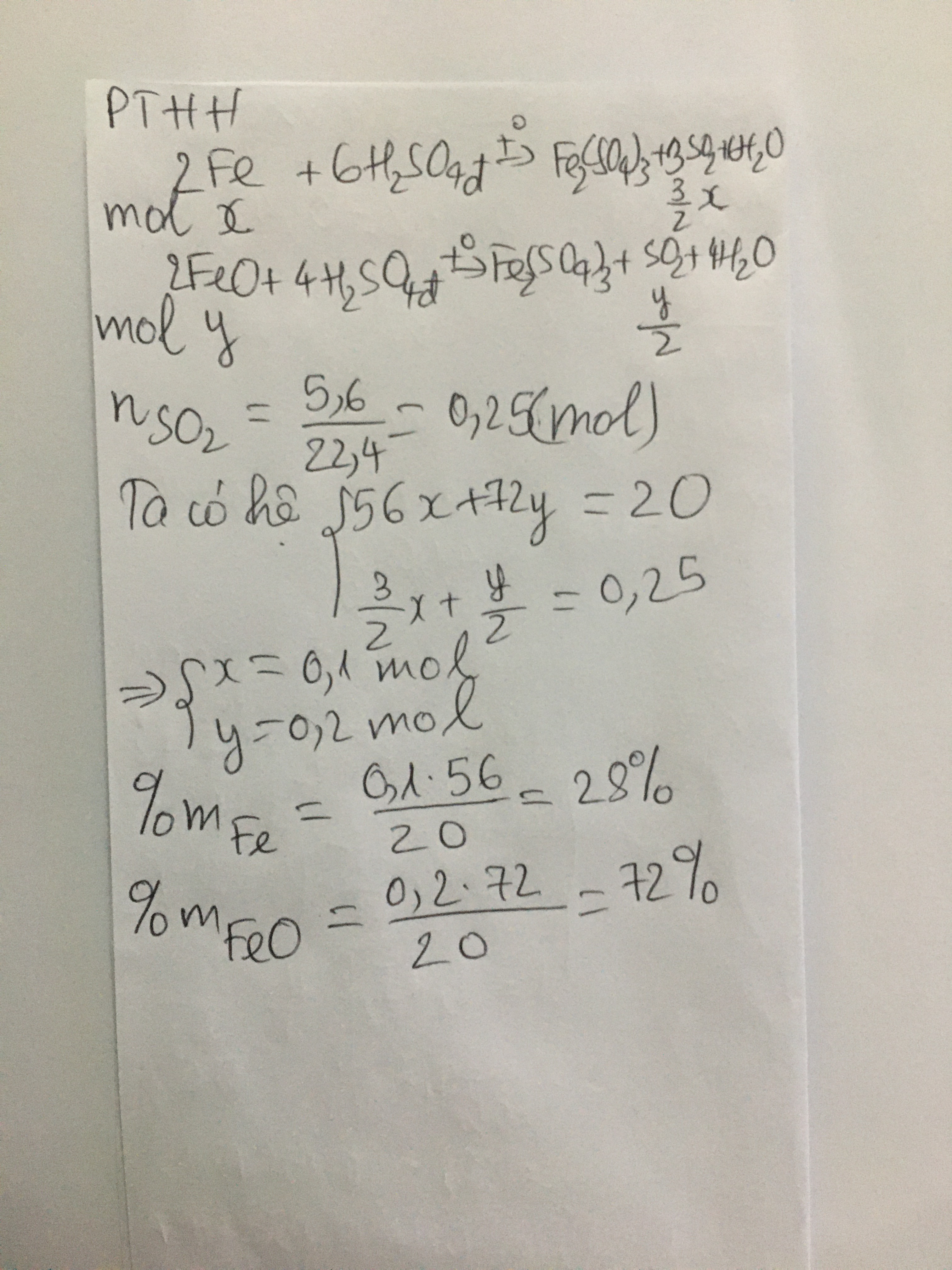 Cho 20g hỗn hộp Fe và FeO tác dụng hoàn toàn với dd H2SO4 đặc nóng dư, thu được 5,6 lít khí SO2 (đktc sản phẩm khử duy nhất) tính phần trăm khối lượng mỗi chất trong hỗn hợp tan dần