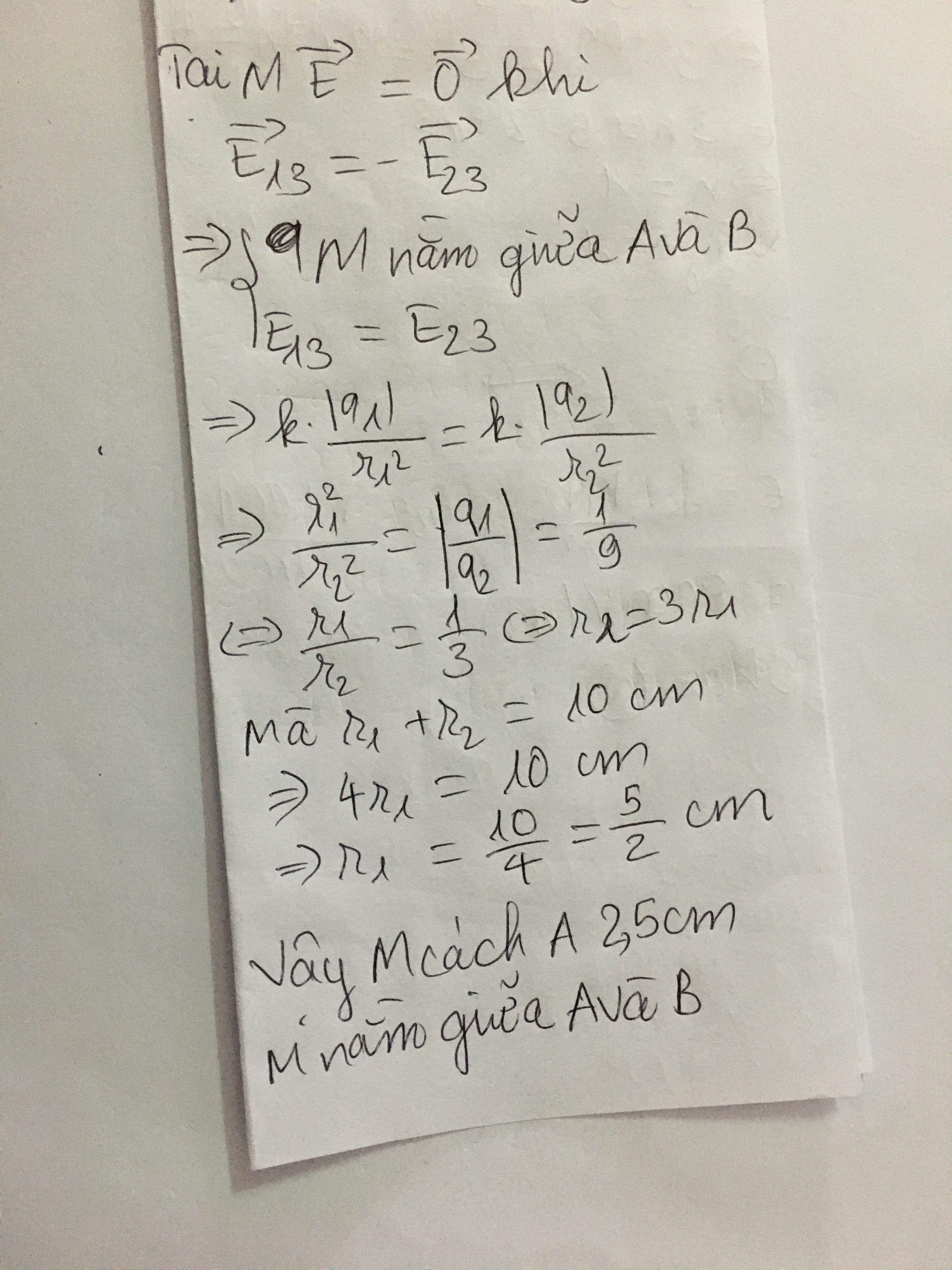 Bài 12: Hai điện tích q1 = 2.10-8C và q2 = 18.10-8C lần lượt đặt cố định tại hai điểm A và B cách nhau 10cm trong không khí .Hãy xác định vị trí của điểm M để tại đó véctơ điện trường tổng hợp có cường độ điện trường bằng 0.