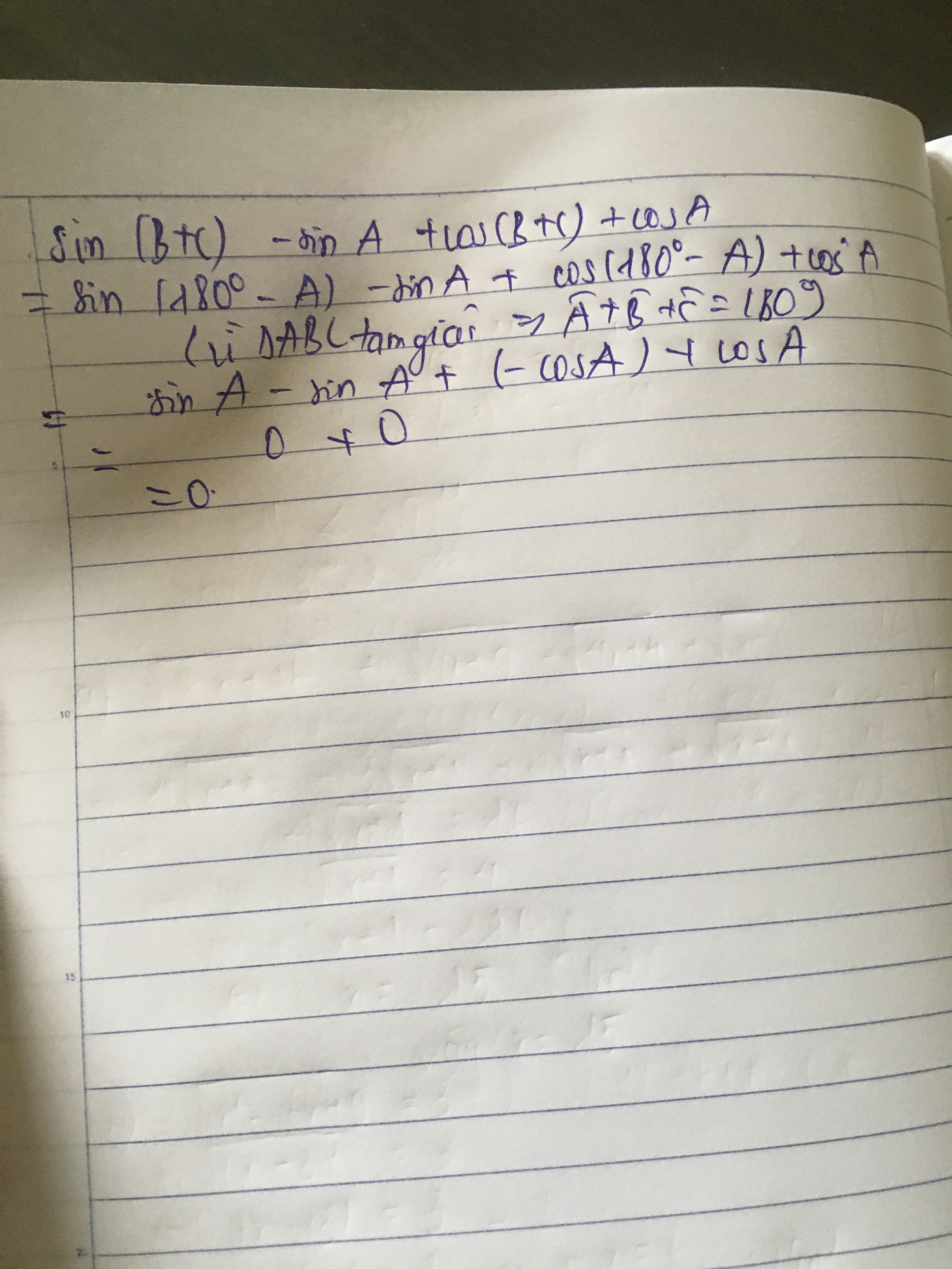 (19)Cho A,B,C là ba góc của tam giác ABC rút gọn biểu thức sin(B+C)- sinA+ cos(B+C)+ cosA được kết quả là