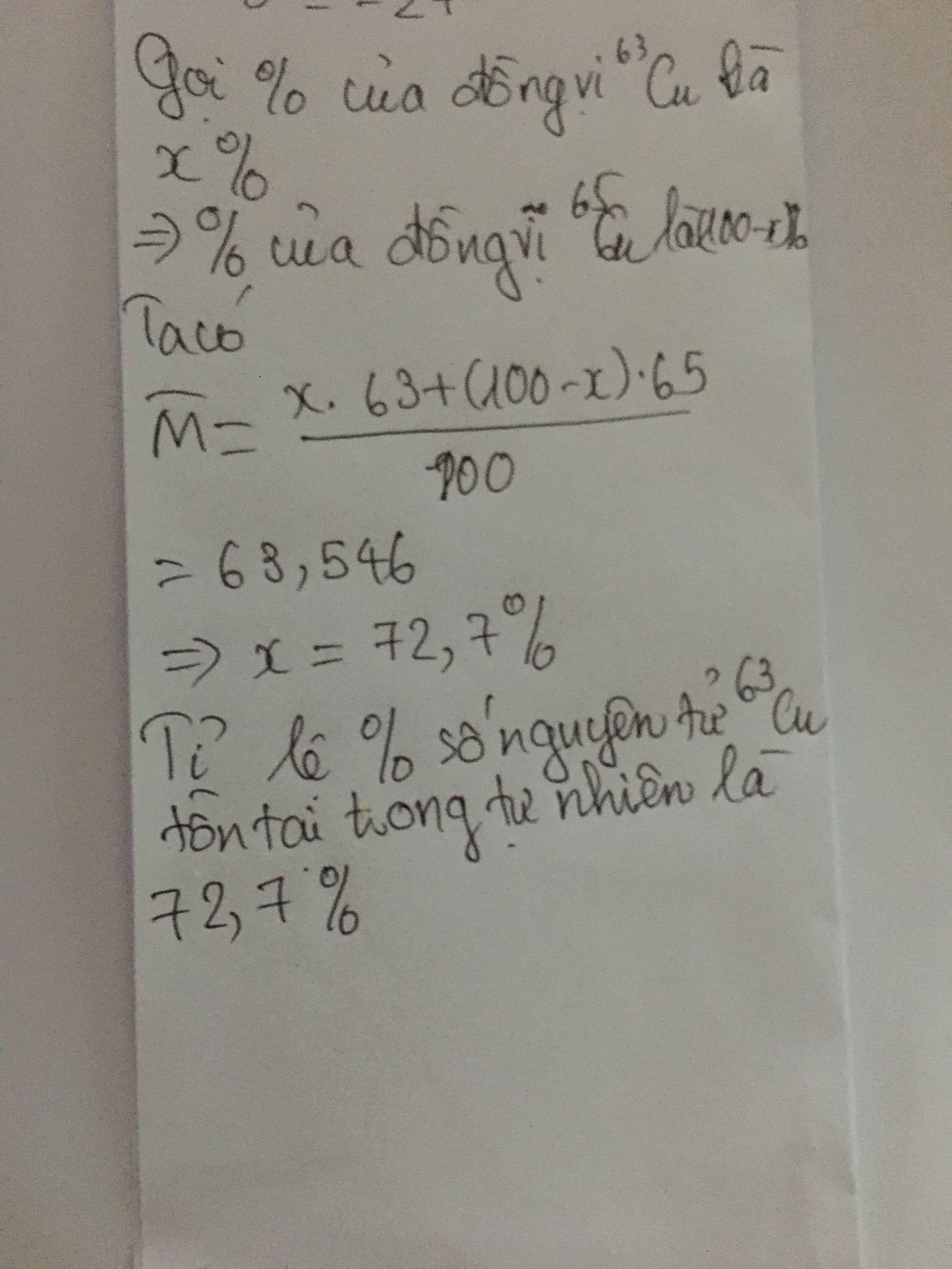 Nguyên tử khối trung bình của đồng bằng 63,546. Đồng tồn tại trong tự nhiên dưới hai dạng đồng vị 63 Cu và 65 Cu . Tính tỉ lệ % số nguyên tử đồng 63 Cu tồn tại trong tự nhiên