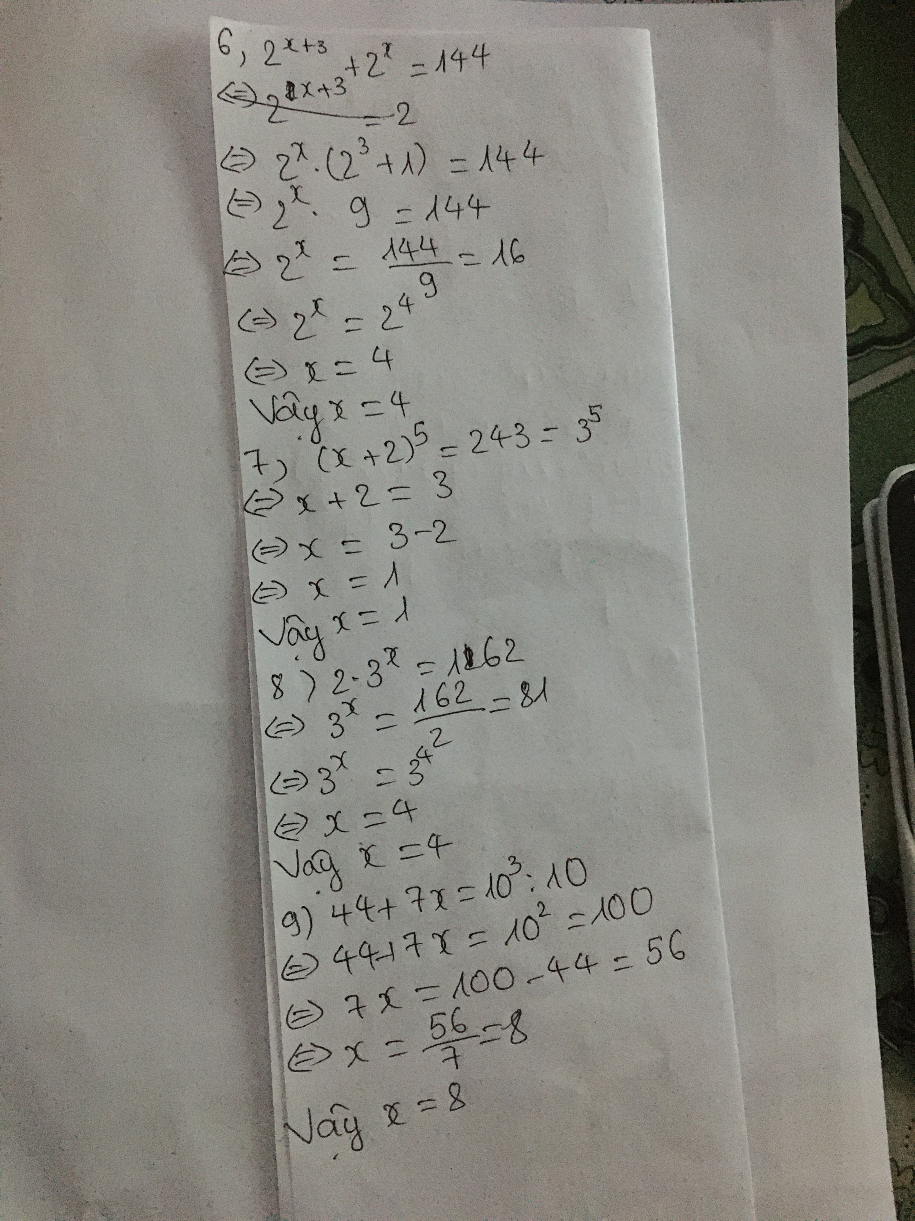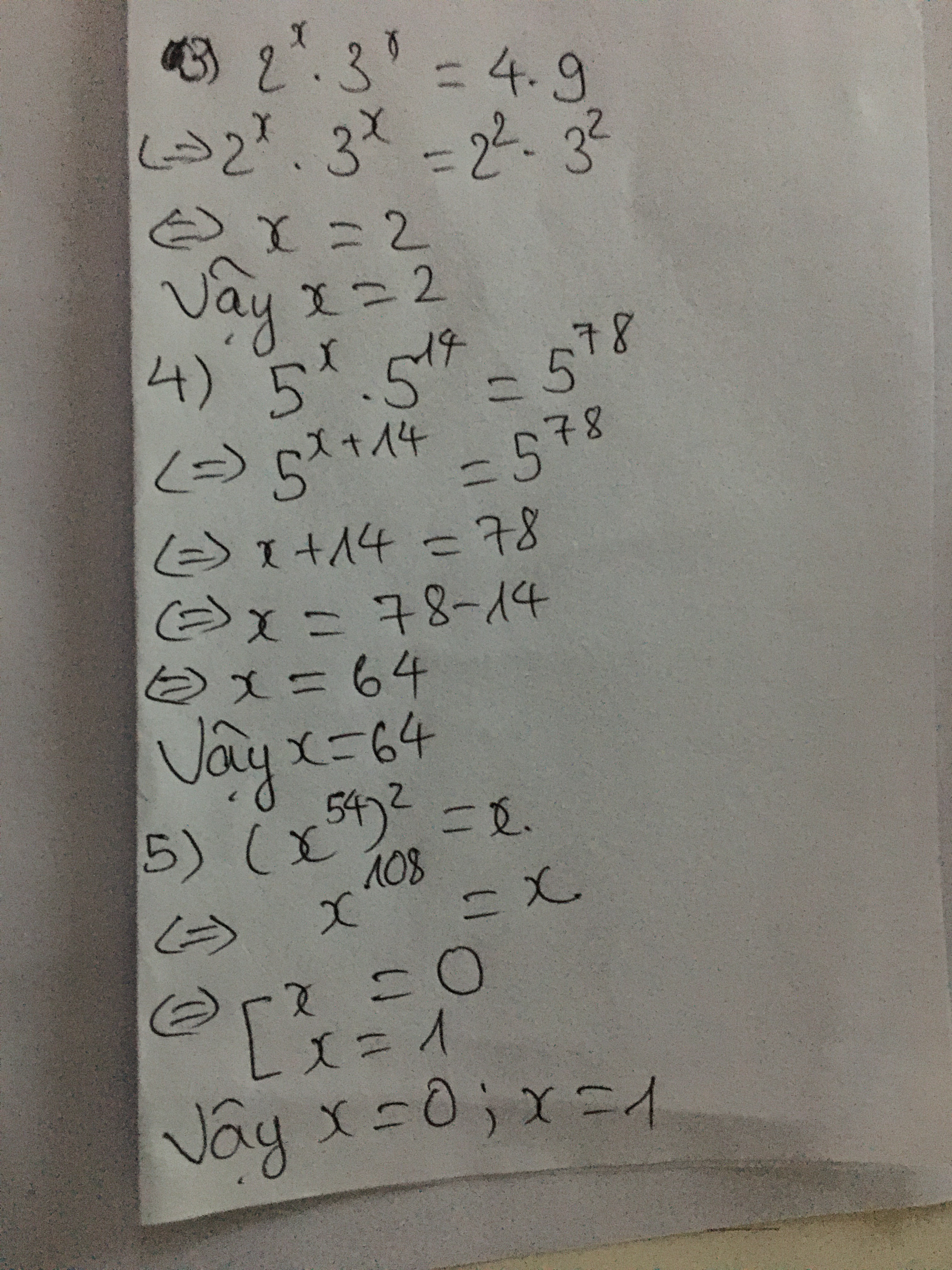 3)2^x.3^x=4.9. 4)5^x.5^14=5^78. 5)(x^54)^2=x. 6)2^x+3+2^x=144(cái 2^x+3 nghĩa là 2 mũ x cộng với 3 nha mn,kiểu^x+3). 7)(x+2)^5=243. 8)2.3^x=162. 9)44+7x=10^3:10. 10)12(x-1):3=4^3+2^3. {3),4),5) là số thứ tự các phép tính}