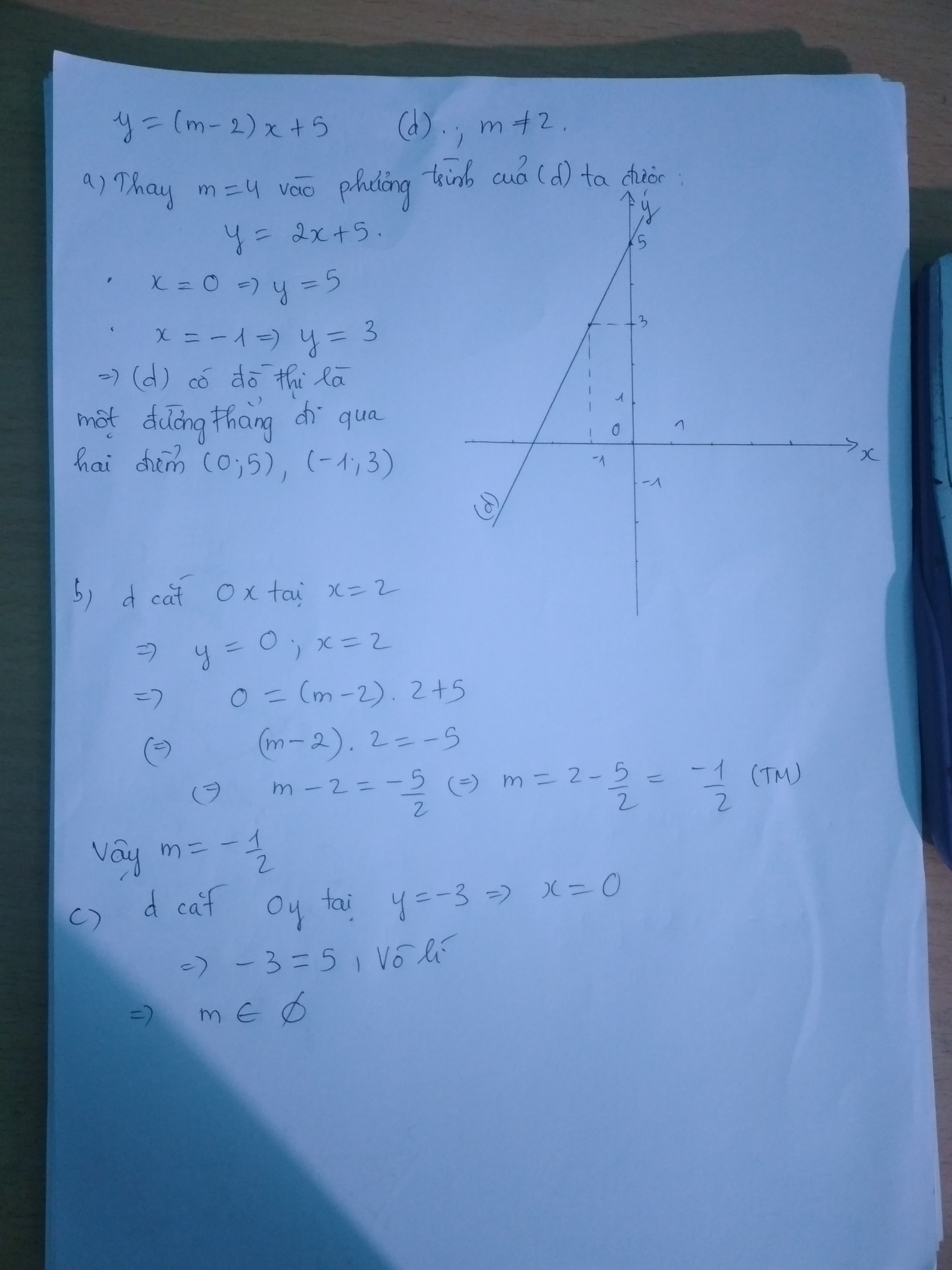 Cho hàm số y = (m − 2)x + 5 có đồ thị là đường thẳng (d) (m là tham số, 𝑚 ≠ 2)