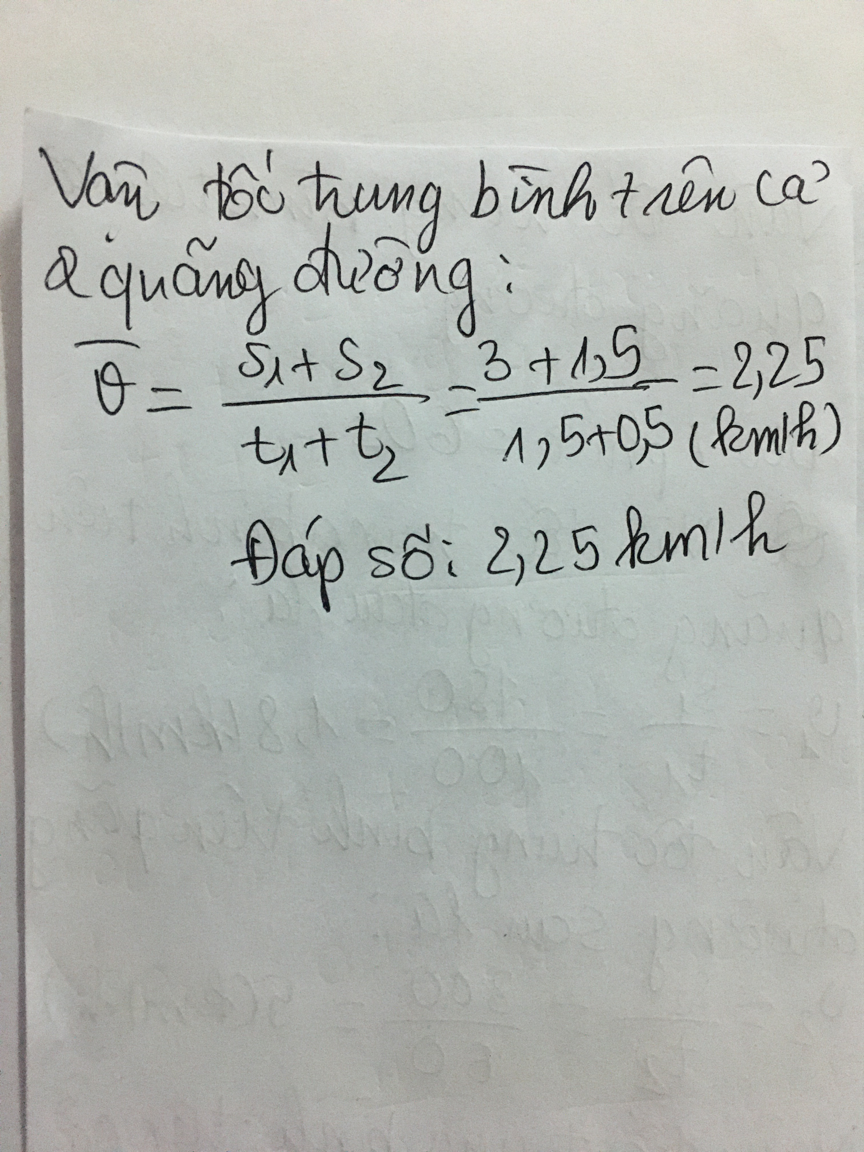 một người đi bộ đều quãng đường đầu dài 3km với vận tốc 1,5h . Ở quãng đường tiếp theo dài 1,5km người đó đi hết 0,5h . Tính vận tốc trung bình của người đó trên cả hai quãng đường?