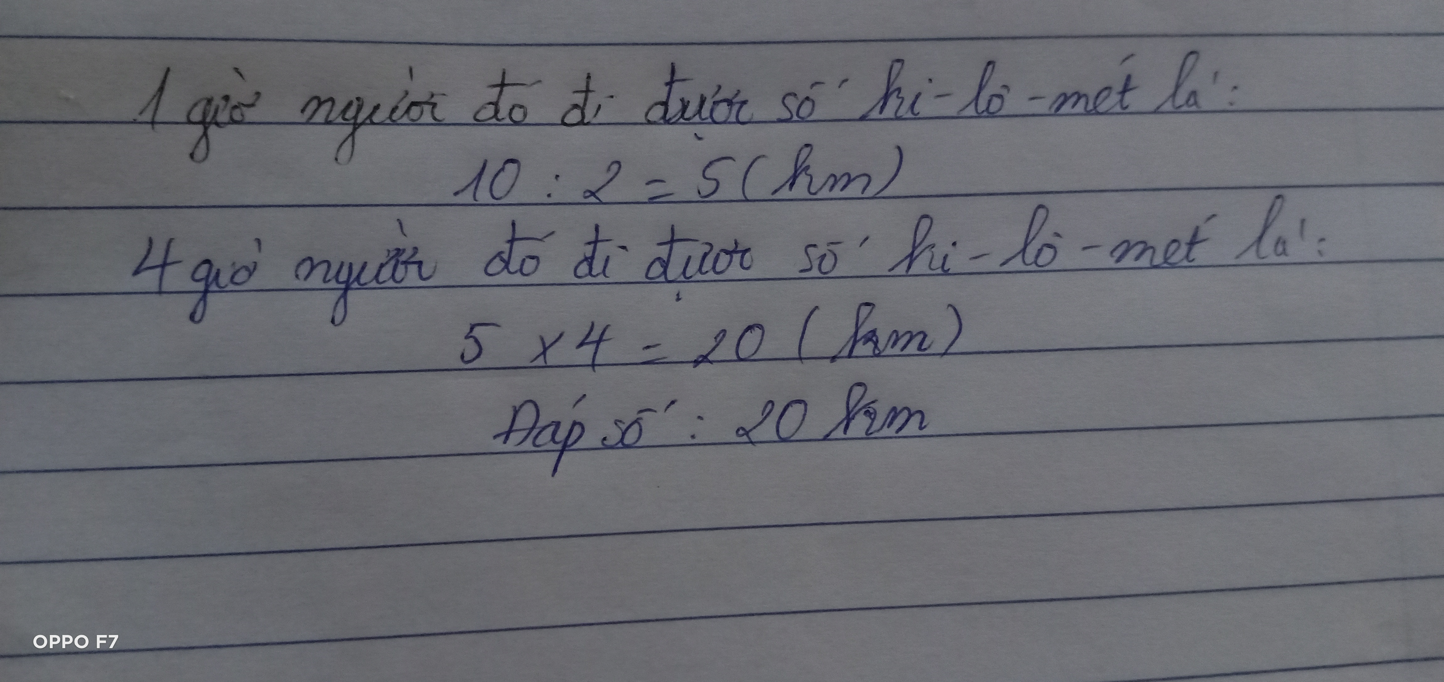Một người đi bộ trong 2 giờ đi được 10 km. Hỏi người đi bộ trong 4 giờ đi được bao nhiêu km ?