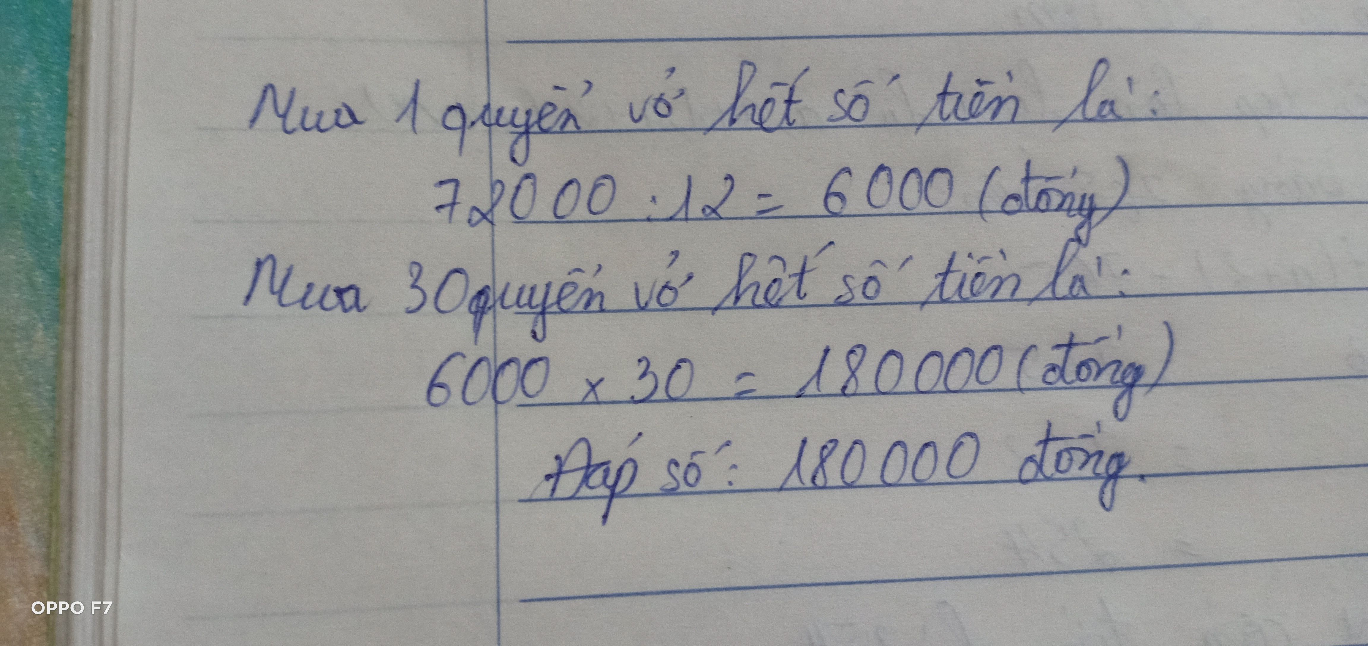 Mua 12 quyển vở hết 72000 đồng.Hỏi mua 30 quyển vở như thế hết bao nhiêu tiền
