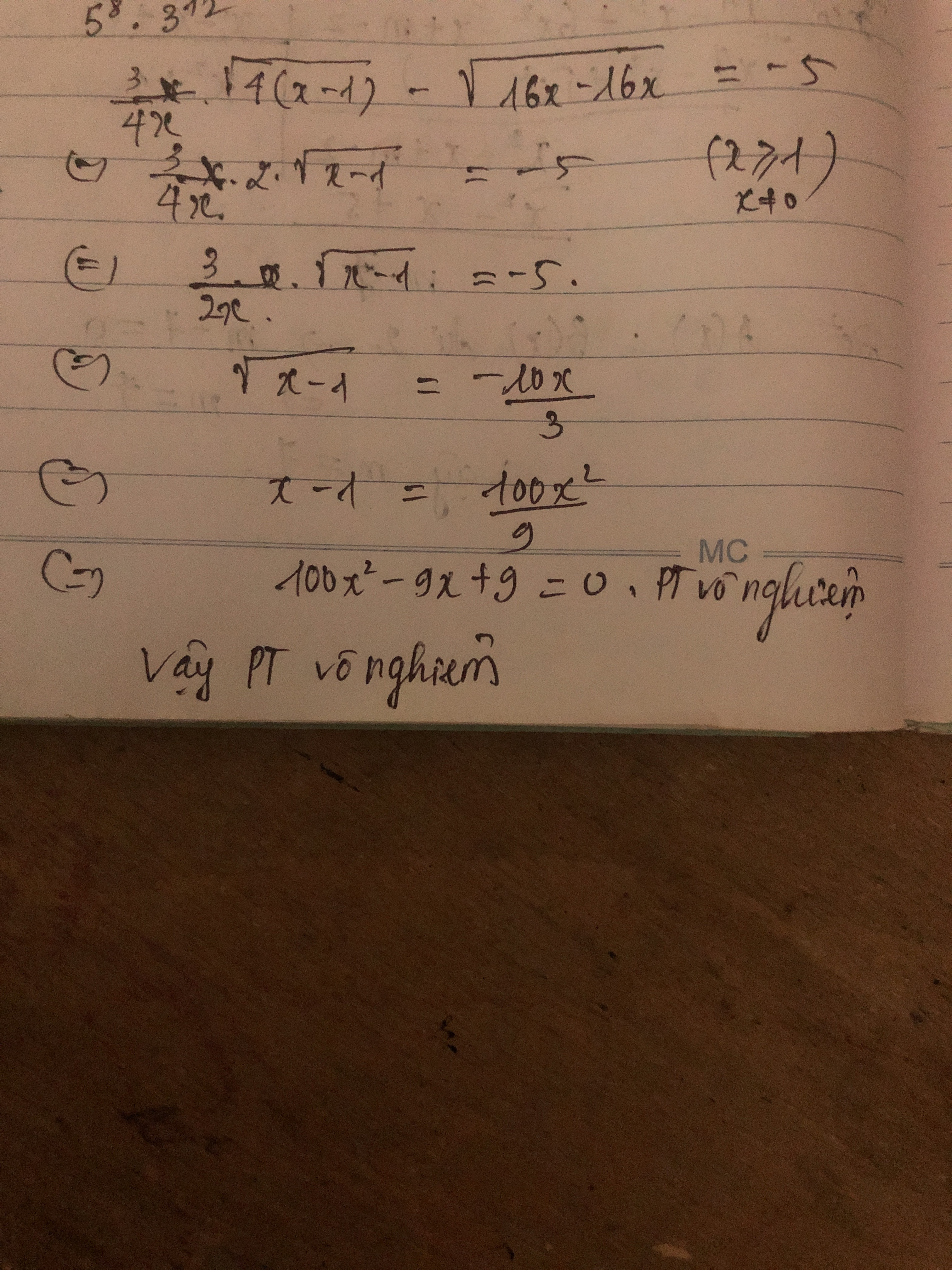 3/4x căn 4(x-1) - căn 16x-16x =-5