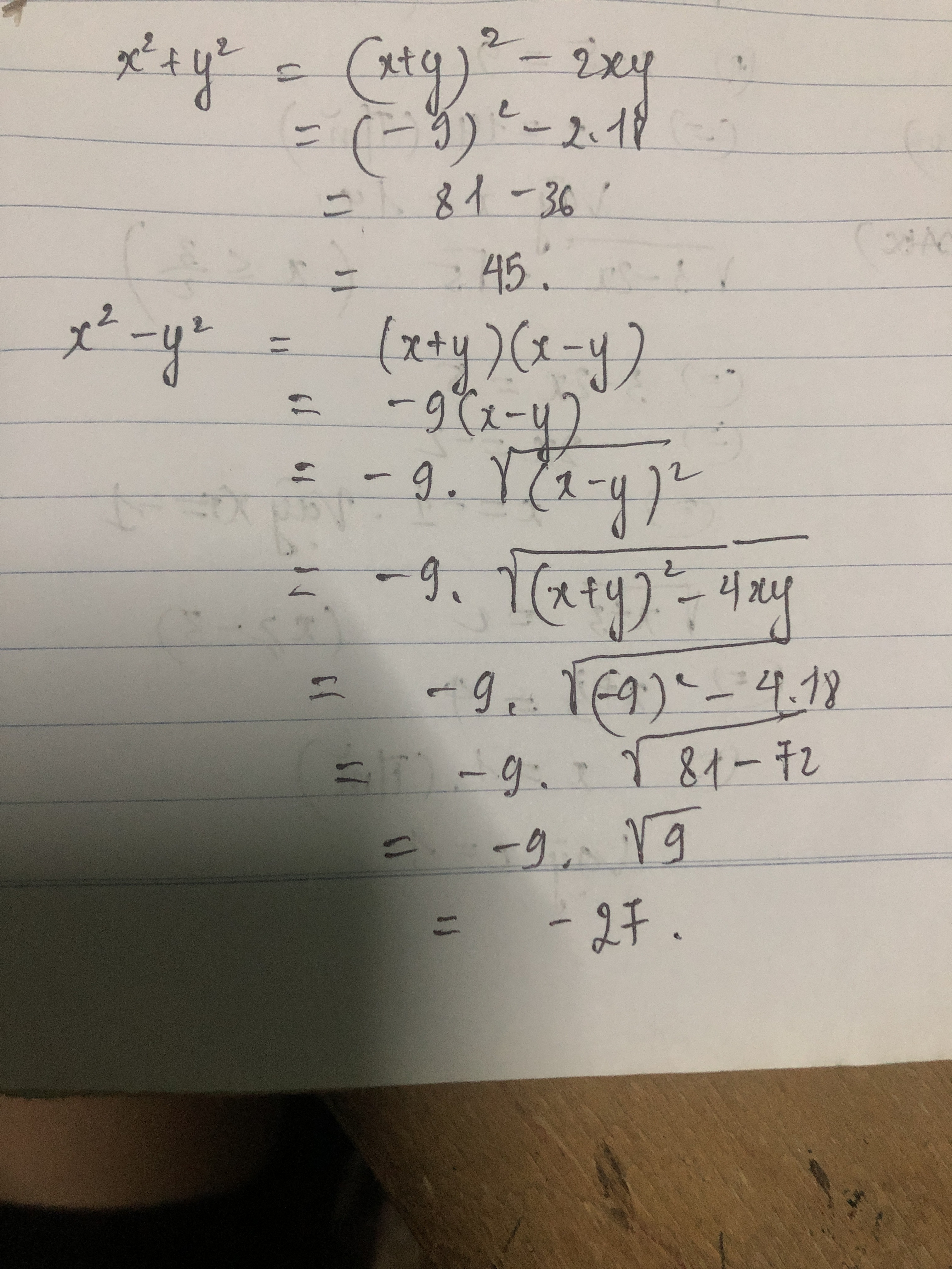 Cho x+y=-9 và xy=18 không tính giá trị của x và y .Hãy tính giá trị của các biểu thức sau: a, x^2+ y^2 b, x^2- y^2