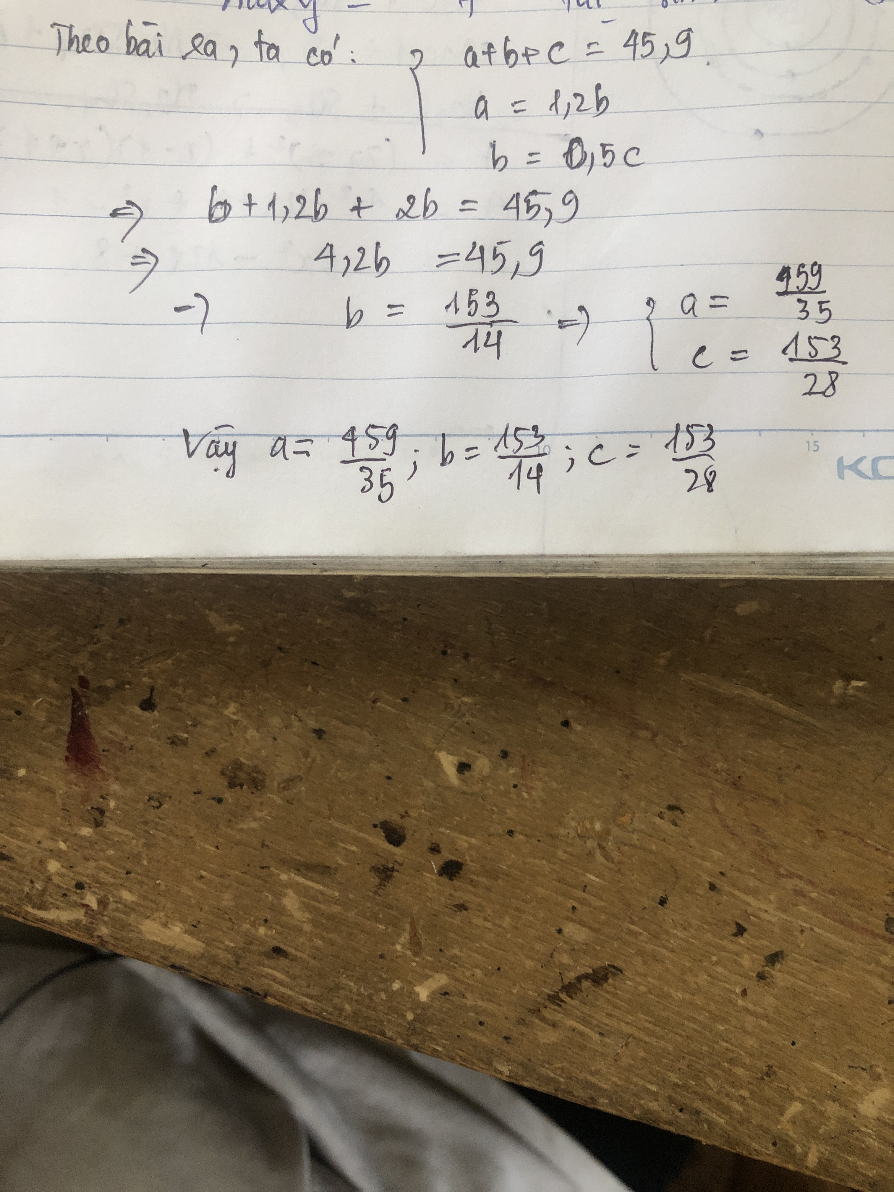 Tổng 3 số thập phân là 45,9. Số thứ nhất bằng 1,2 số thứ 2. Số thứ 2 bằng 0,5 số thứ 3. Tìm số thứ 3