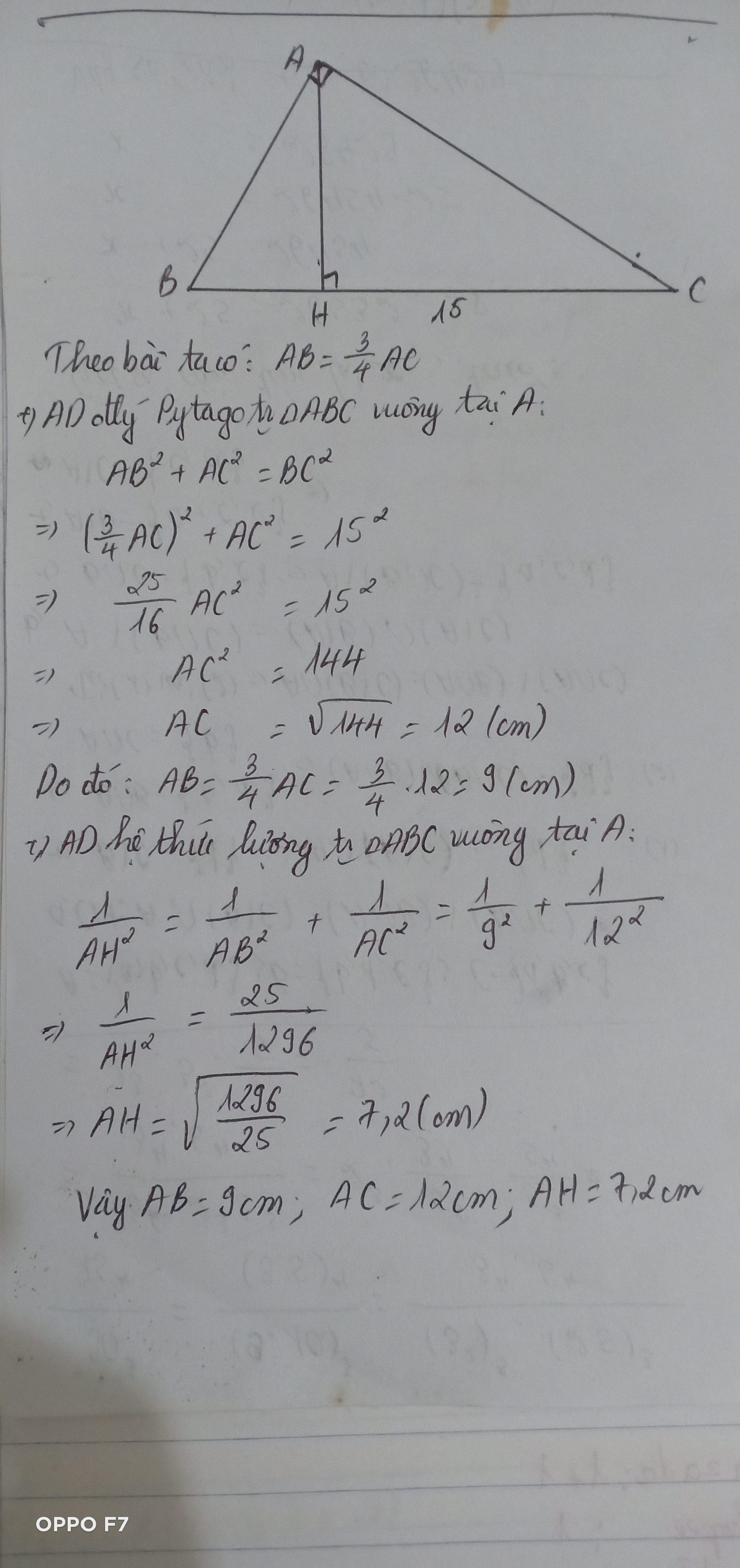 cho tam giác ABC vuông tại A ,có BC=15cm.Tính độ dài hai cạnh góc vuông và đường cao AH,biết AB=3/4AC