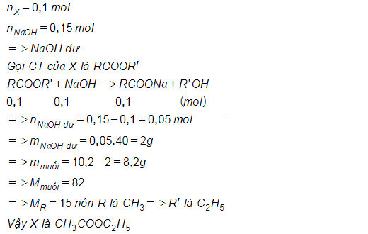 nX=0,1 molnNaOH=0,15 mol=>NaOH dưGọi CT của X là RCOOR'RCOOR'+NaOH->RCOONa+R'OH0,1 0,1 0,1 (mol)=>nNaOH dư=0,15-0,1=0,05 mol=>mNaOH dư=0,05.40=2g=>mmuối=10,2-2=8,2g=>Mmuối=82=>MR=15 nên R là CH3=>R' là C2H5Vậy X là CH3COOC2H5.