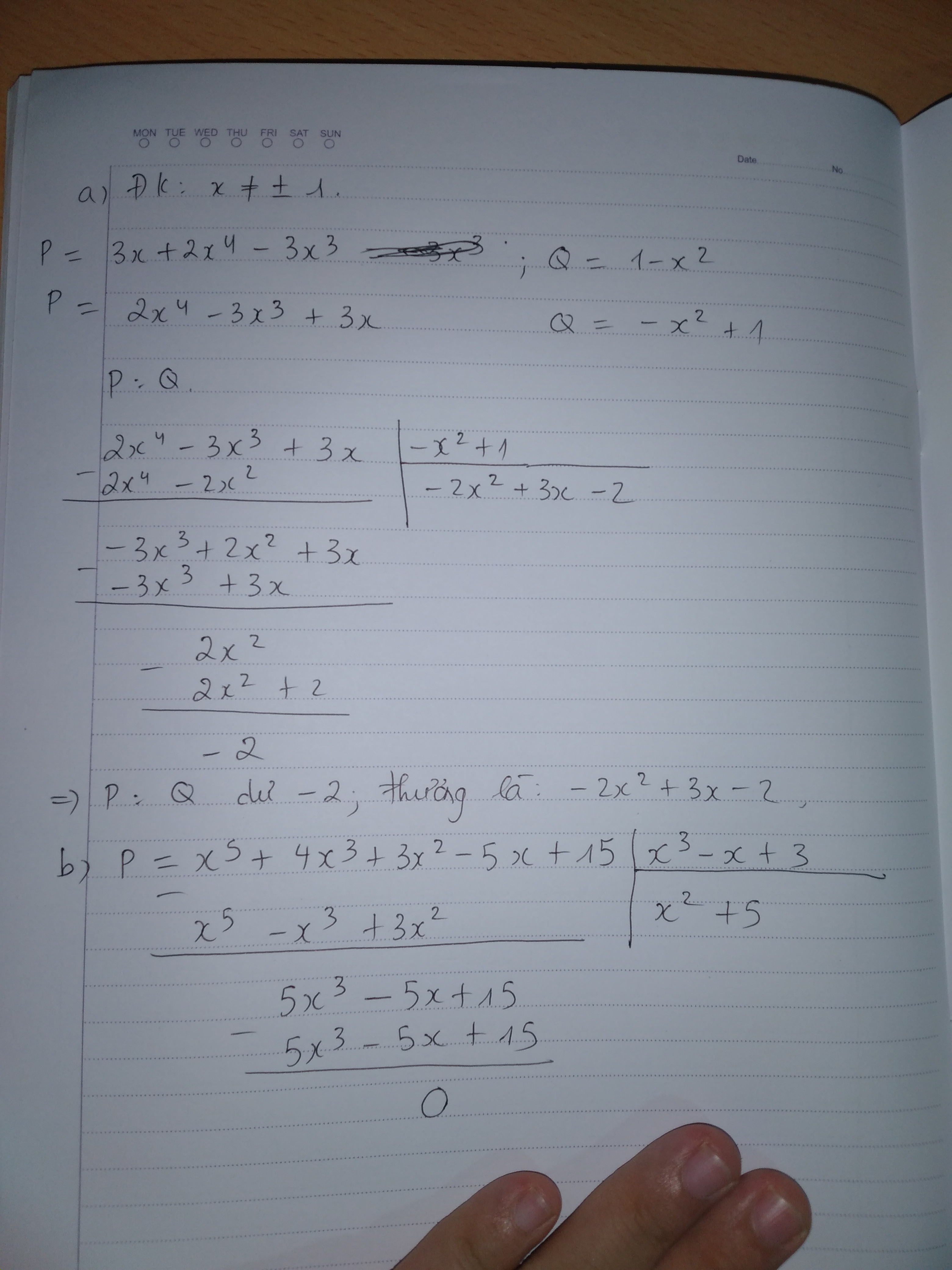 b)x^5 + 4x^3 + 3x^2 - 5x + 15 : x^3 - x +3