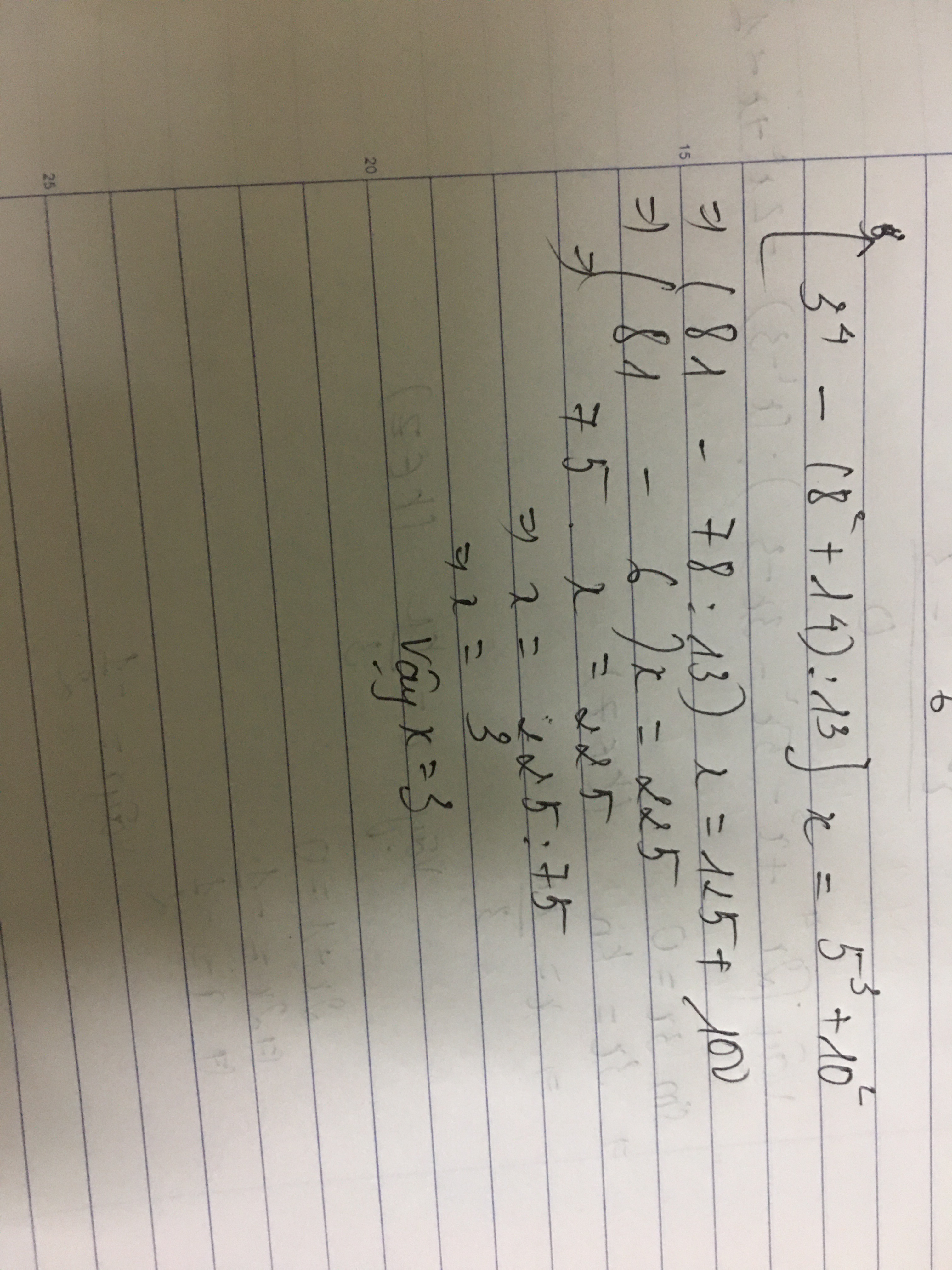 [3⁴ - ( 8² + 14 ) : 13 ] x = 5³ + 10²