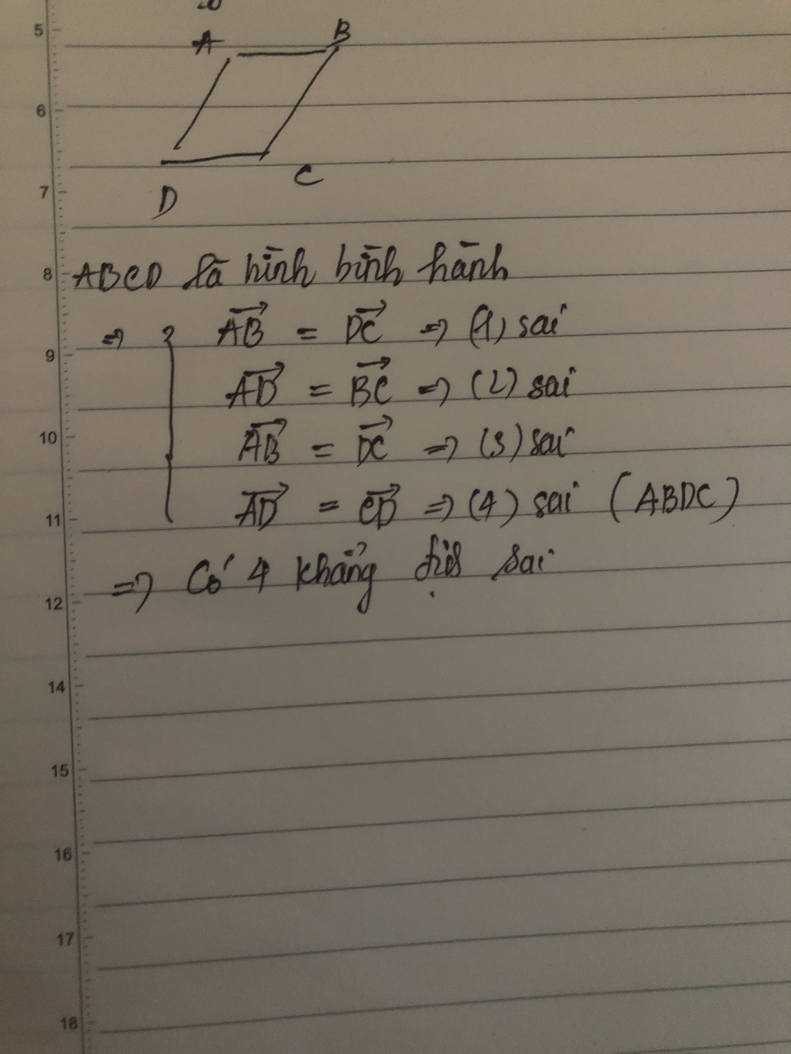(4) nếu vecto AD = vectoCB thì 4 điểm ABCD theo thứ tự là đỉnh của hình bình hành.