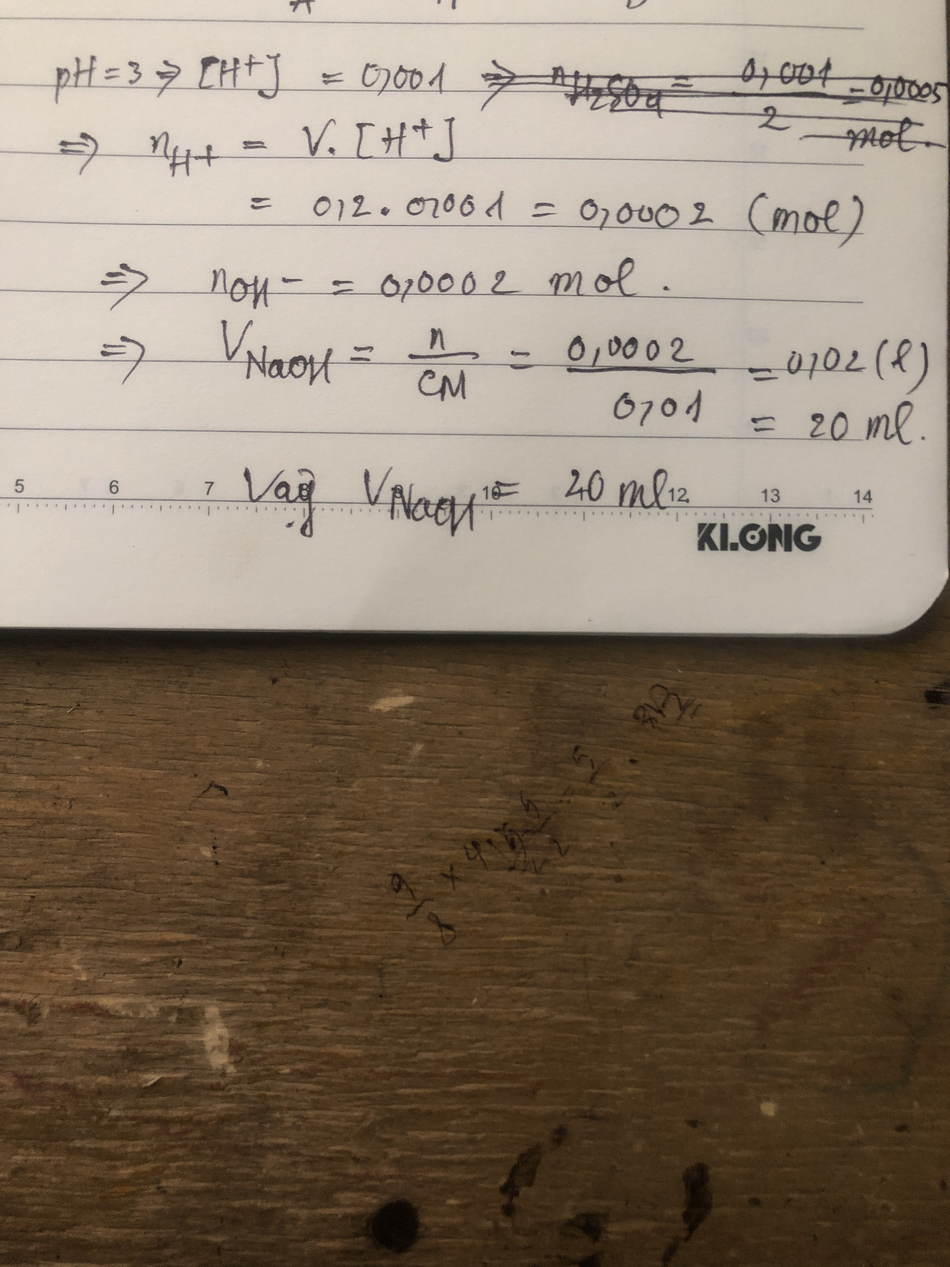 Tính thể tích dd NaOH 0.01M cần để trung hòa 200ml dd H2SO4 có pH=3