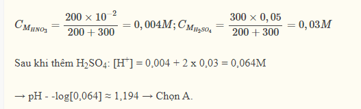 Bài 29. Cho 200 ml dung dịch HNO3 có pH = 2; nếu thêm 300ml dung dịch H2SO4 0,05M vào dung dịch trên thì dung dịch thu được có pH bằng bao nhiêu?