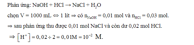 Trộn lẫn V ml đe NaOH 0,01M với V ml dd HCl 0,03 M đc 2V ml dd Y. Dd Y có pH là